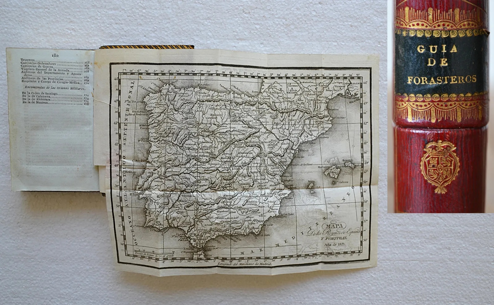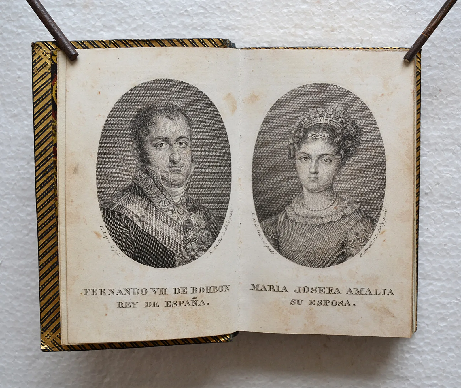 Deux portraits des époux royaux d’Espagne : Fernando VII de Bourbon & son épouse Maria Josefa Amalia, dessinés par V. Lopez et L. de La Cruz, deux titres gravés par A. Guerrero, et une carte d’Espagne repliée in fine.
