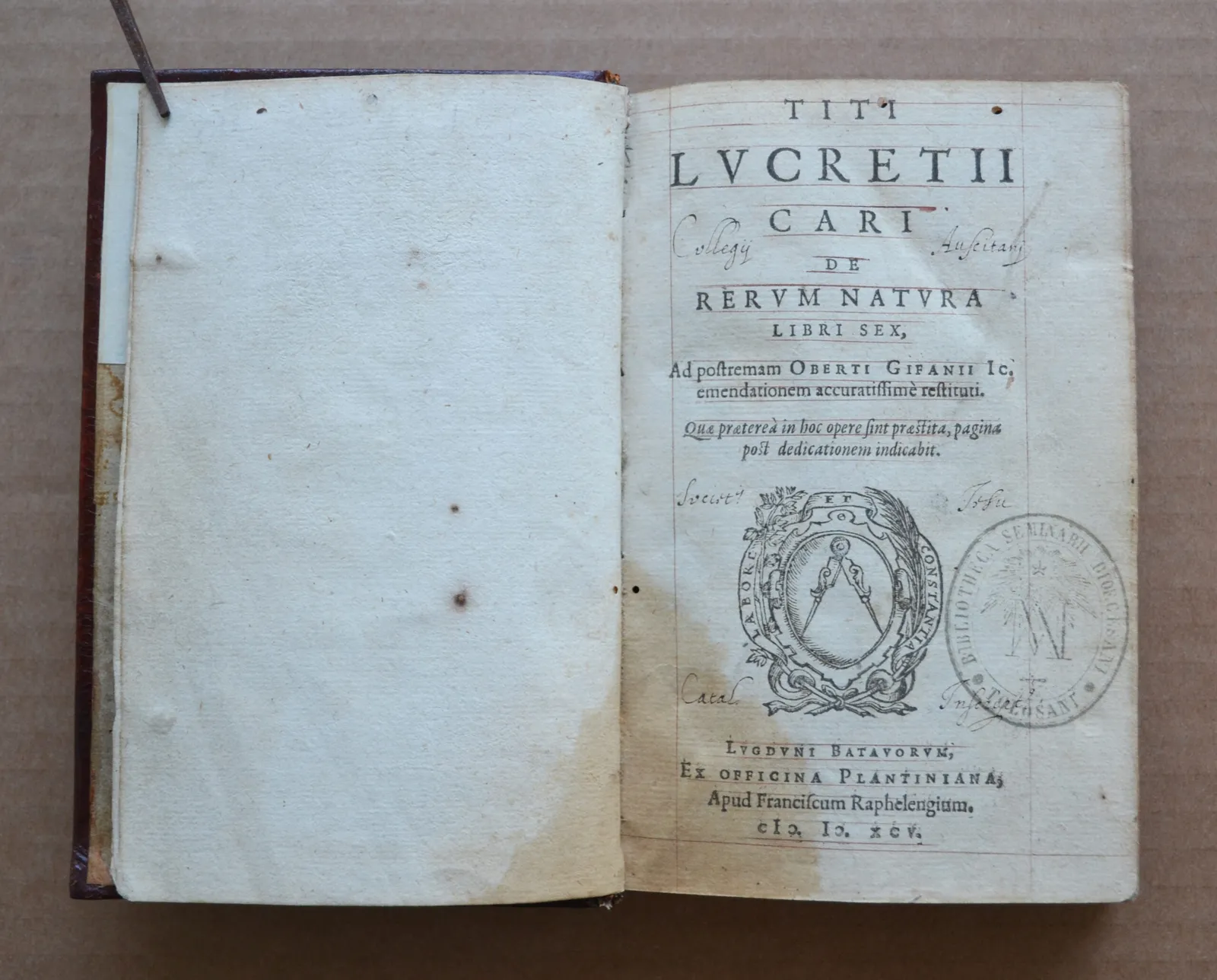 Magnifique exemplaire de cette impression plantinienne réglée du De rerum natura, qui constitue une traduction de la doctrine d’Épicure, dans une rare et spectaculaire reliure aux petits fers dorés de l’époque.
