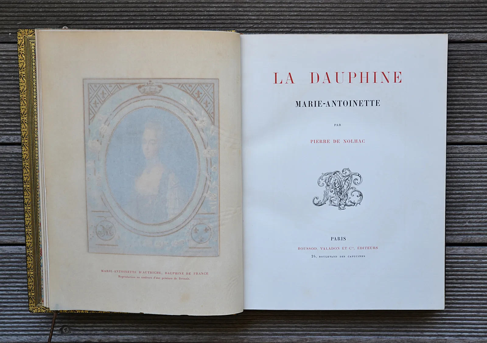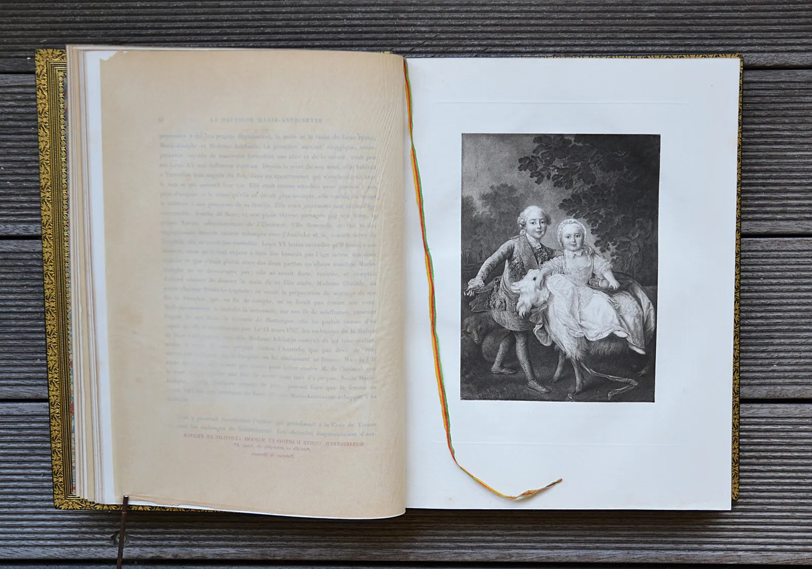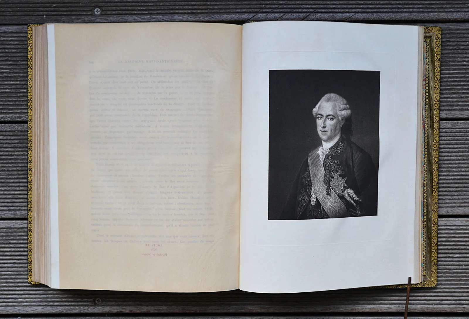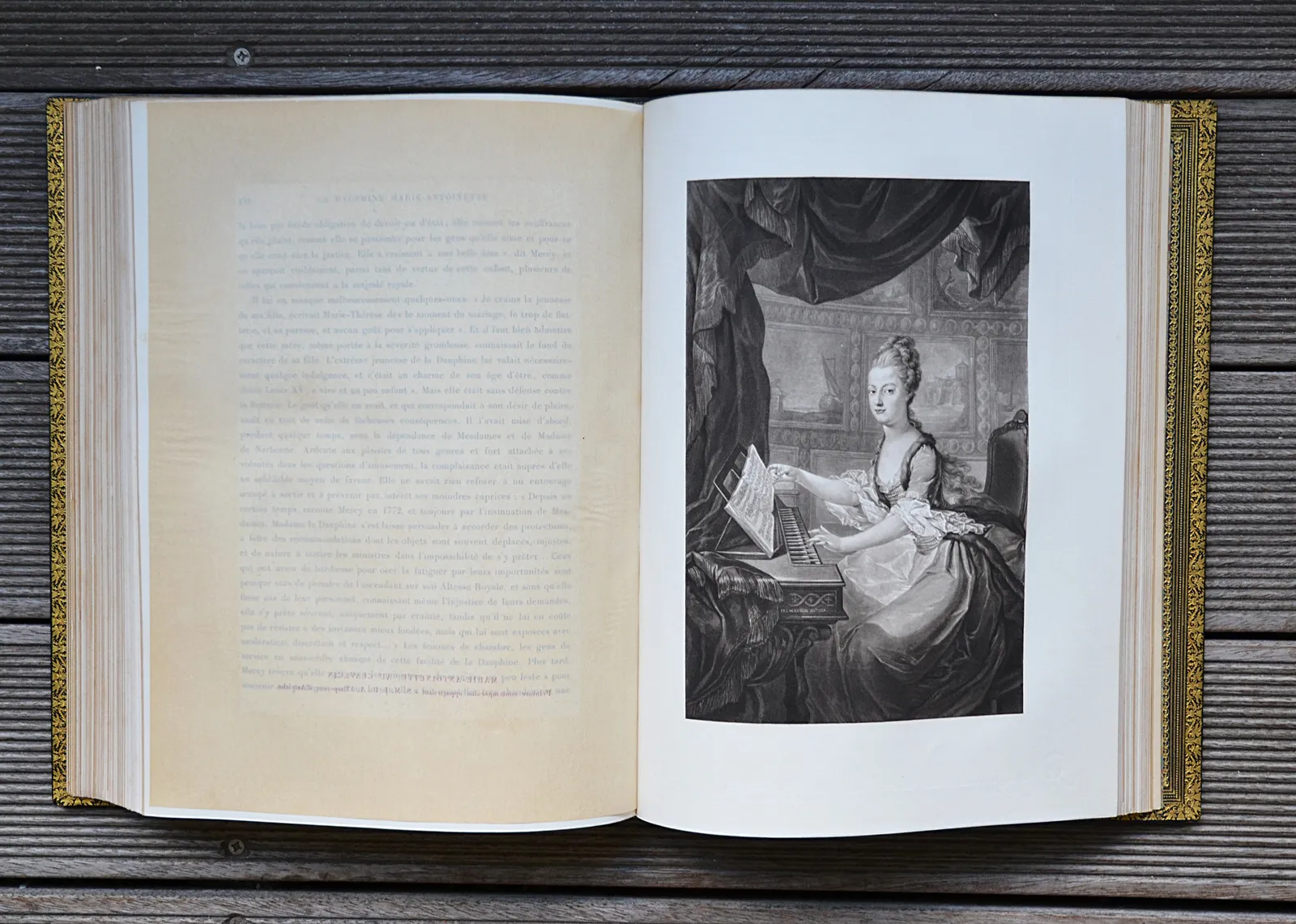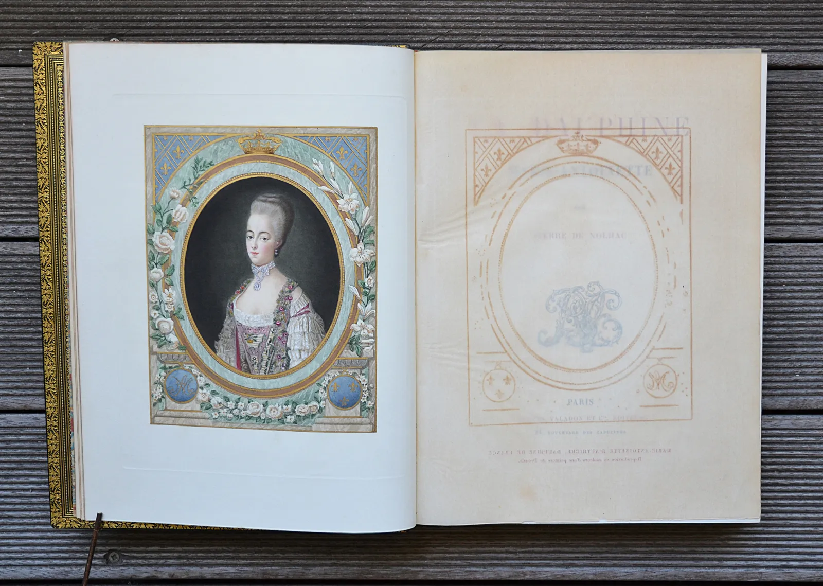 Un volume grand in-4 (25 x 32 cm.) de : (2ff.) – 181 pp. – (1f.) ; maroquin bleu-nuit, armoiries dorées de Marie-Antoinette au centre des plats, fleur de lys dorée dans les angles, dos à nerfs orné de fleurs de lys, date dorée en queue, double filet dorée sur les coupes, large roulette dorée à l’intérieur, tranches dorées, couverture conservée (Durvand).