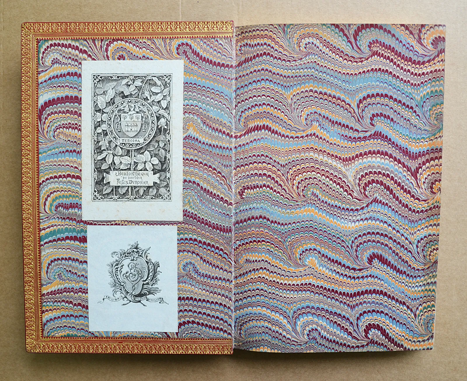 Deux grands ex-libris sur la première contregarde : le premier, de la bibliothèque du docteur Félix Durosier, le second, celui de Jacques Vieillard.