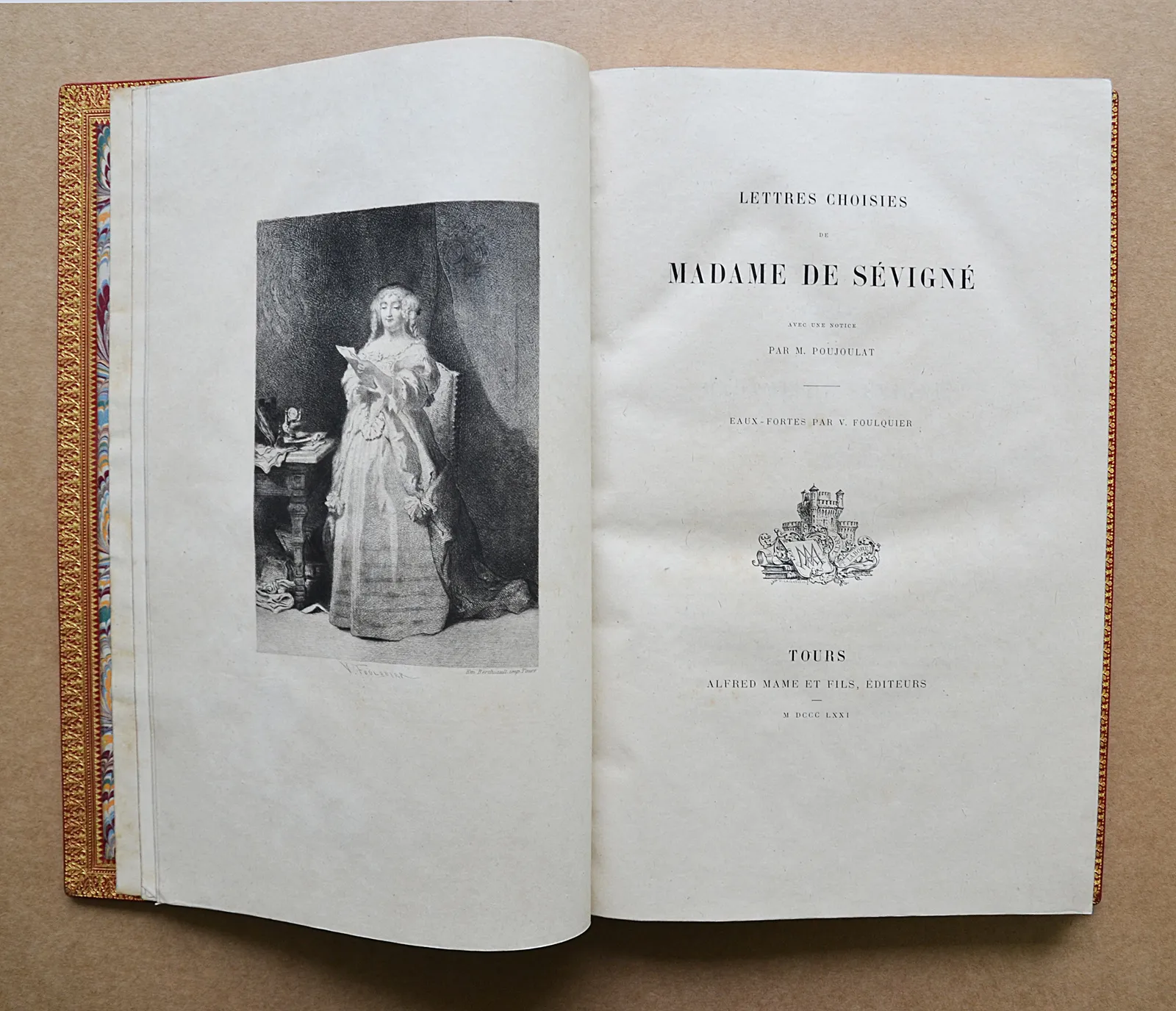 Tours, Alfred Mame et Fils, Éditeurs, 1871. Un volume grand in-8 (19 x 29 cm.) de XXVI – 408 pp. – (2ff.) ; maroquin rouge, triple filet doré sur les plats, dos à nerfs richement orné, double filet doré sur les coupes, large dentelle aux petits fers dorés à l’intérieur, tranches dorées, étui bordé (Chambolle-Duru).