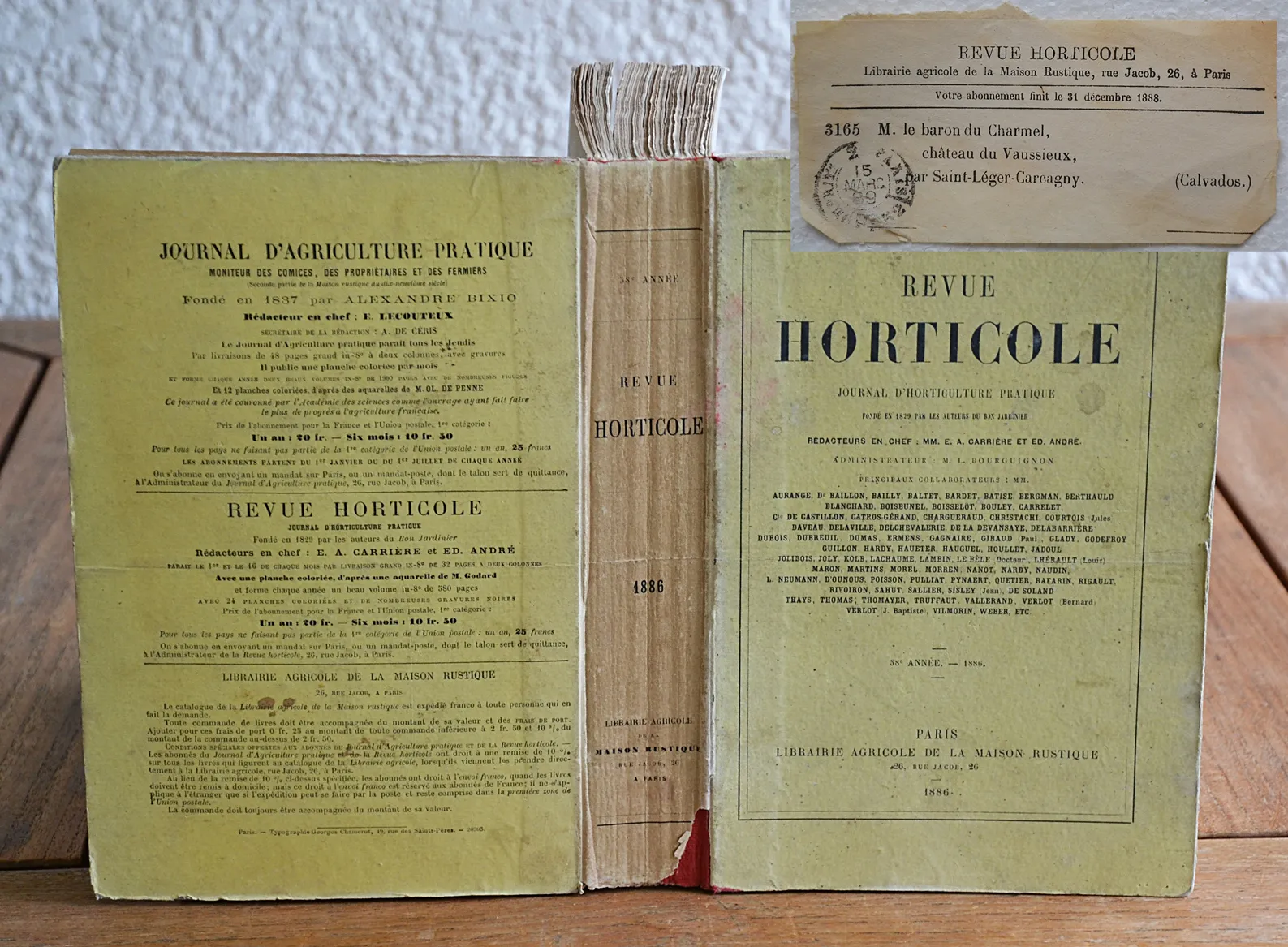 Appartenance : M. le baron du Charmel – Château du Vaussieux – Calvados (étiquette imprimée volante de la Revue horticole). Les 15 autres volumes de la Revue horticole présentés à la vente sous le même pseudonyme (alde5001), proviennent tous du château de Vaussieux (quelques étiquettes de relieur avec le nom du baron du Charmel).