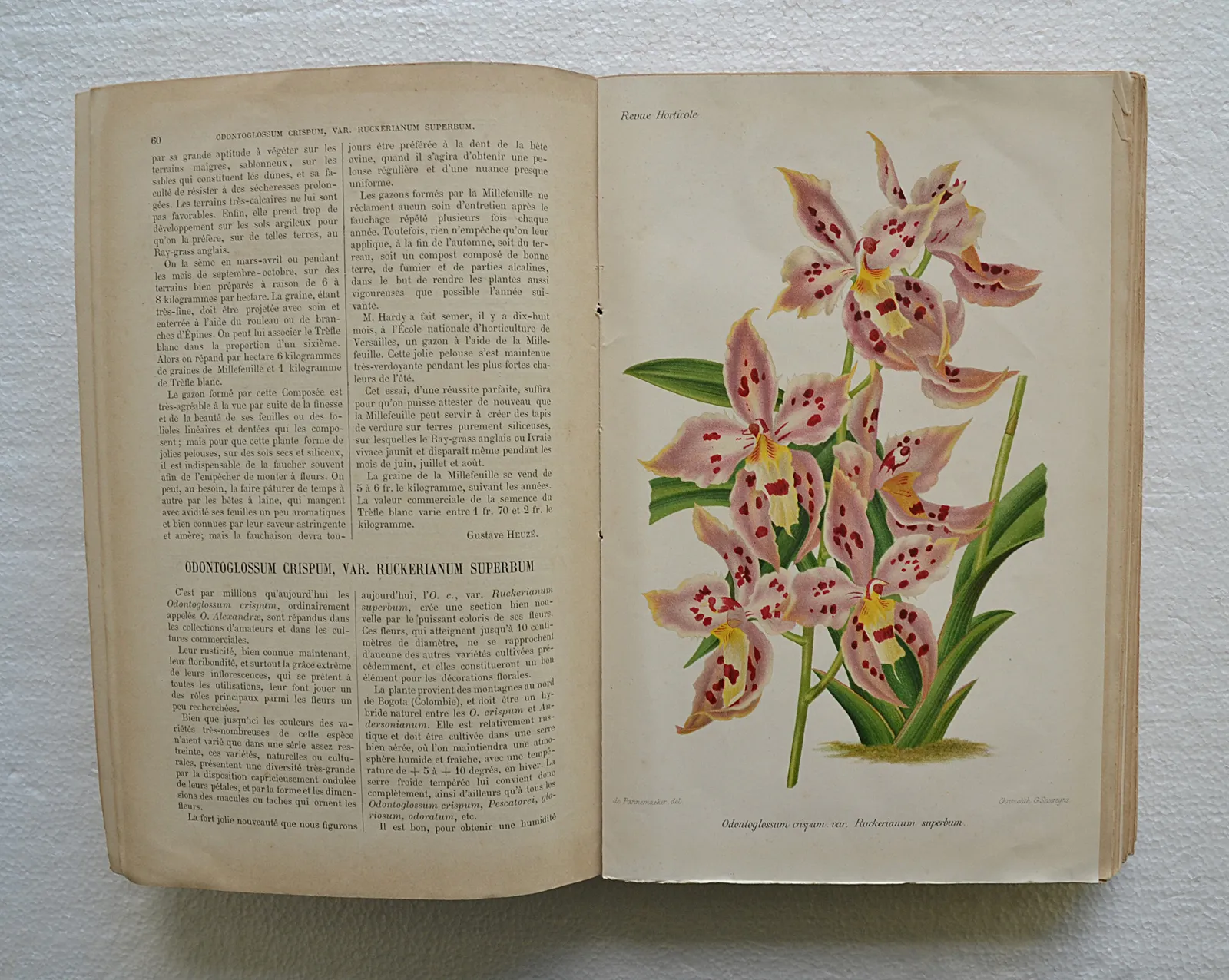 Bon exemplaire de cette célèbre revue horticole du XIX° siècle, illustrée de 24 magnifiques chromolithographies hors-texte, dessinées par Godard et P. de Longpré, et de nombreux dessins en noir dans le texte.