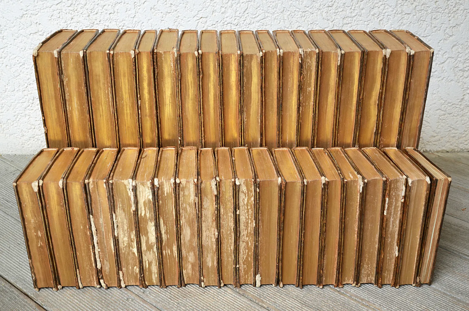 Épidermures et accrocs, notamment sur de nombreuses coiffes avec pertes de cuir ; plusieurs coupes & coins éclatés ; six mors fendillés ; une dizaine de plats avec des traces d’humidité ; des rousseurs, des feuillets roussis, des traces de mouillures et de moisissures plus ou moins prononcées en fonction des volumes : elles sont importantes dans une dizaine de tomes, avec des délitements de papier dans les marges et de dorures sur plusieurs tranches, cf. photos.