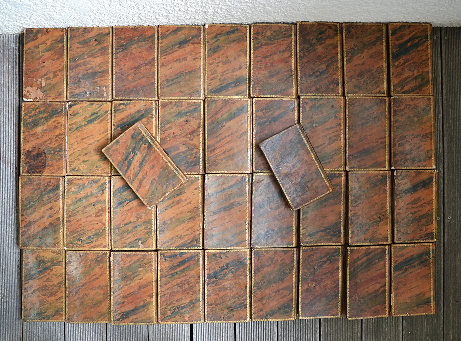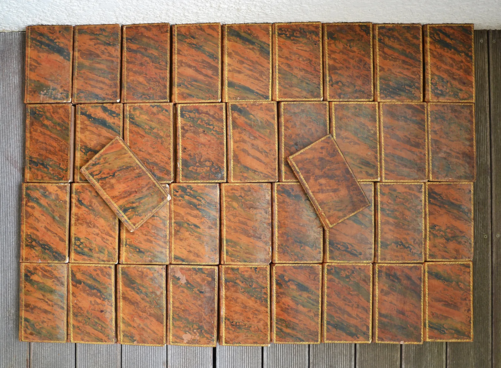 39 tomes en 38 volumes in-8 (13 x 20,3 cm.), veau porphyre, dos lisses richement ornés, roulette dorée sur les plats, pièces de titre et de tomaison en maroquin rouge et noir, filet doré sur les coupes, roulette dorée à l’intérieur, tranches dorées (reliure de l’époque).