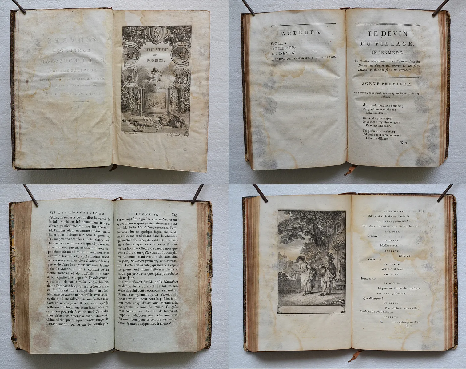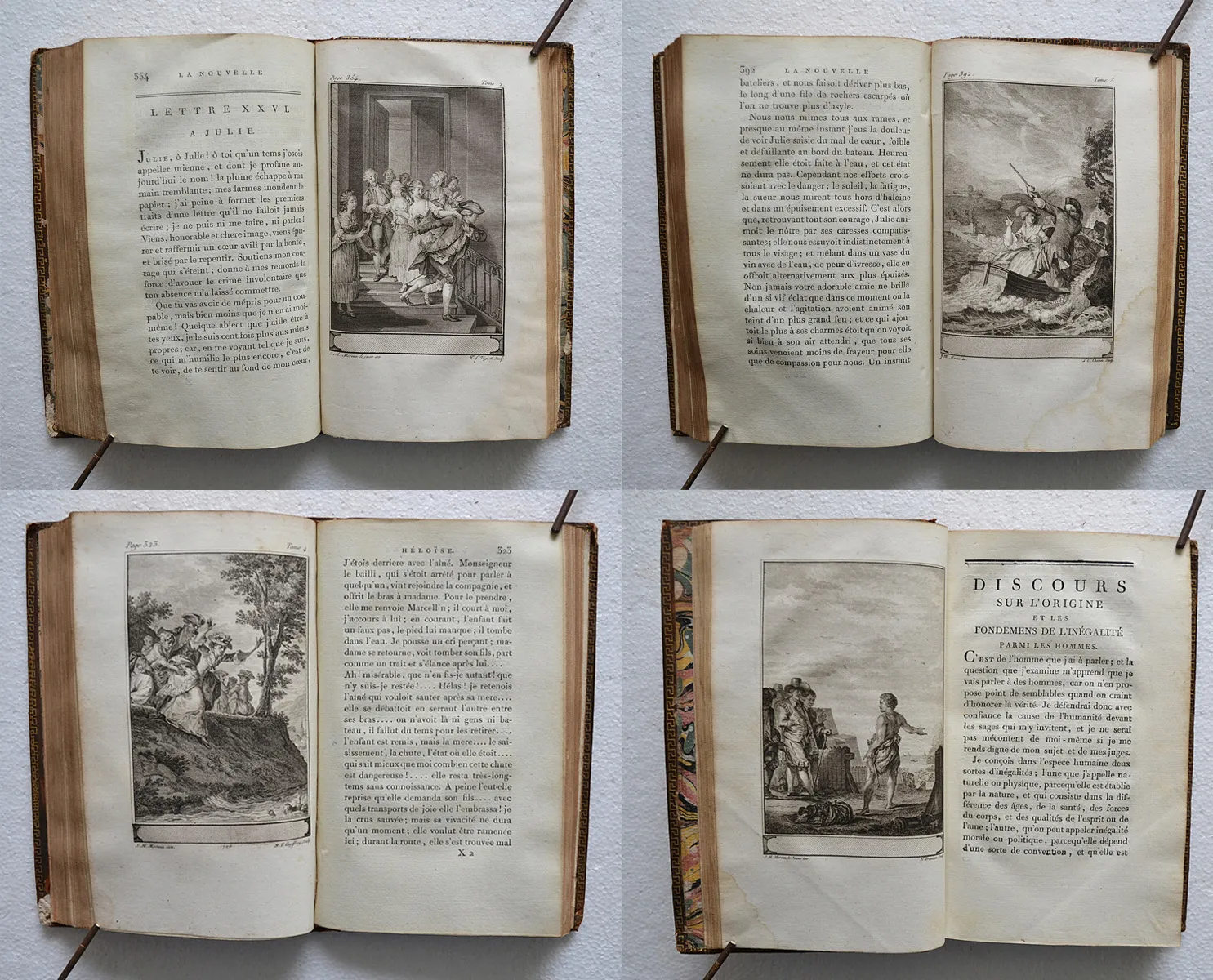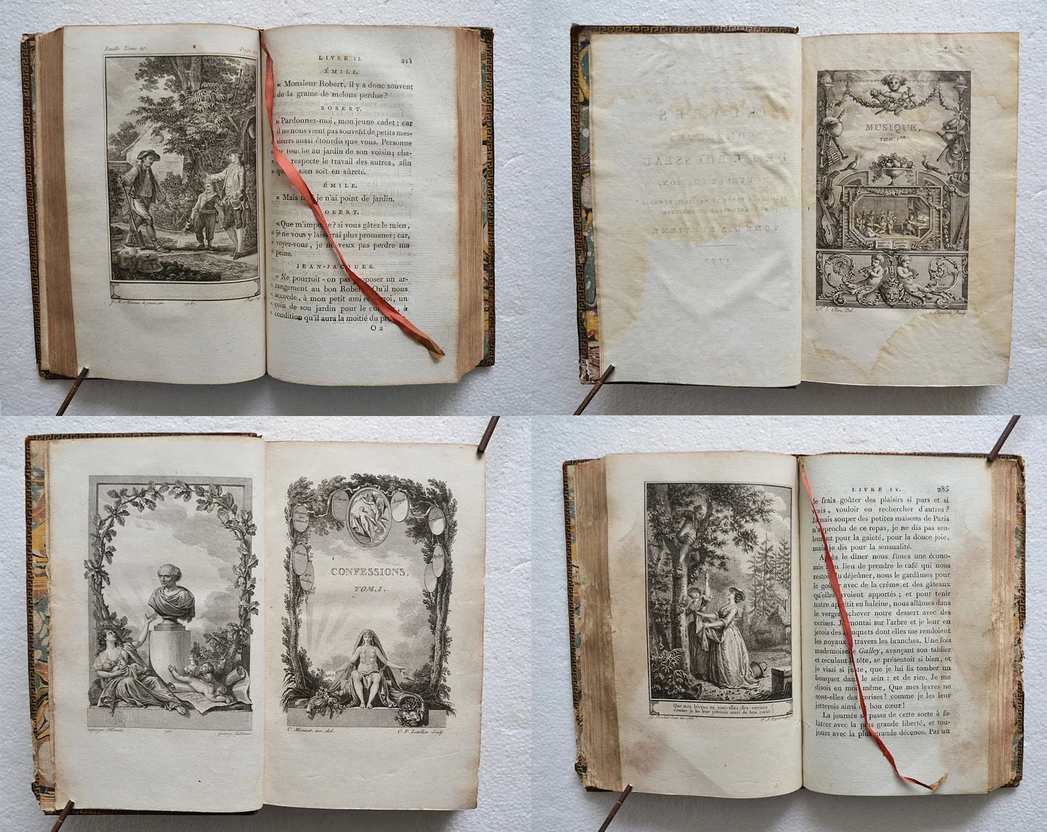 Édition collective des œuvres de Jean-Jacques Rousseau ornée d’un portrait en buste, de 41 frontispices, de 42 figures hors-texte, la plupart d’après Moreau le jeune, Monnet et Marillier, et de 13 planches dépliantes de musique. Le volume 37 contient 319 pages de musiques et d’airs gravés.