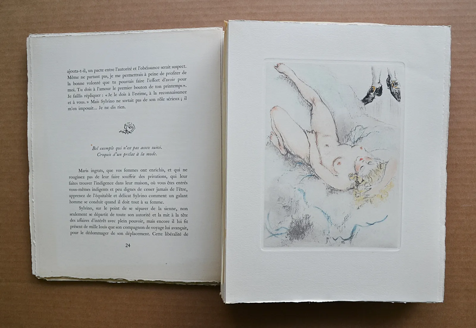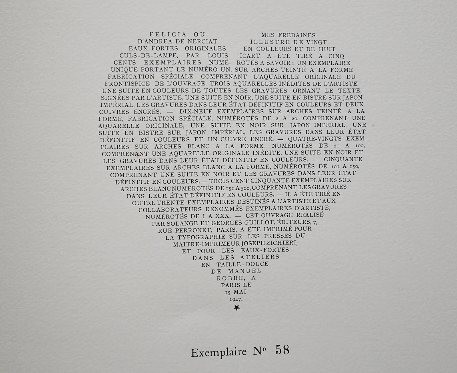 Tirage à 500 exemplaires ; celui-ci, un des 80 ex. sur Arches blanc à la forme numérotés de 21 à 100 (n°58), comprenant une aquarelle originale inédite, une suite en noir, et les gravures dans leur état définitif en couleurs.