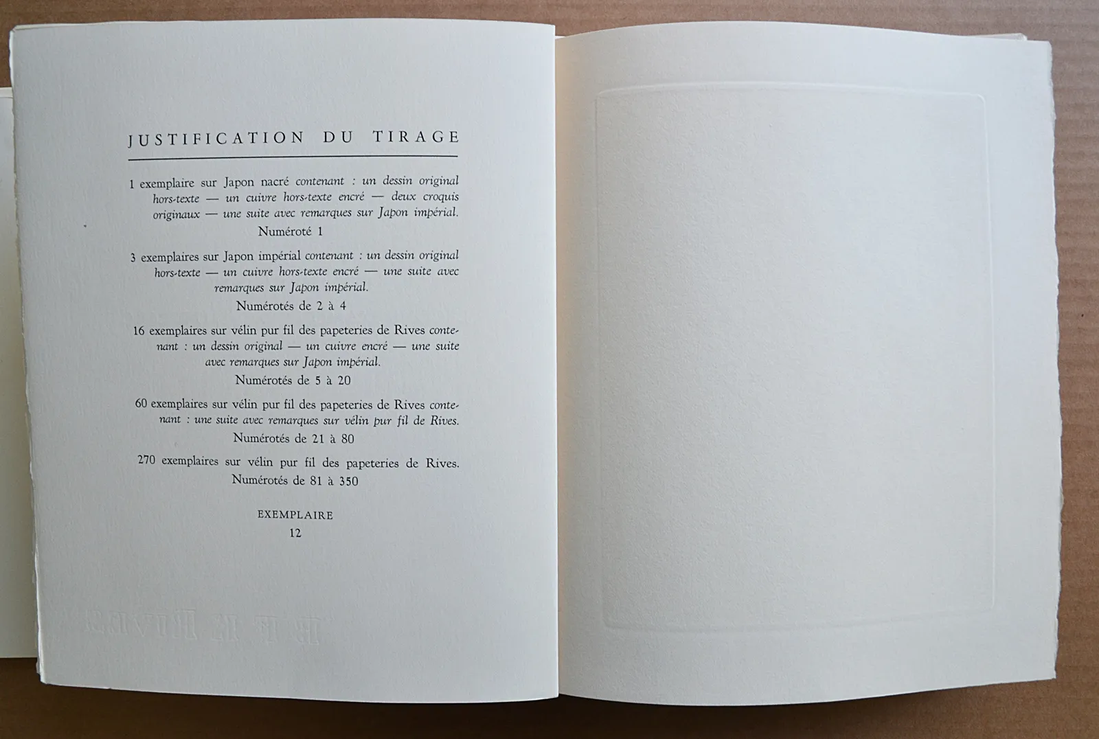 Tirage à 350 exemplaires ; celui-ci, un des 16 ex. sur vélin pur fil des papeteries de Rives contenant : un dessin original – un cuivre encré – une suite avec remarques sur Japon impérial. Numérotés de 5 à 20 (n°12).