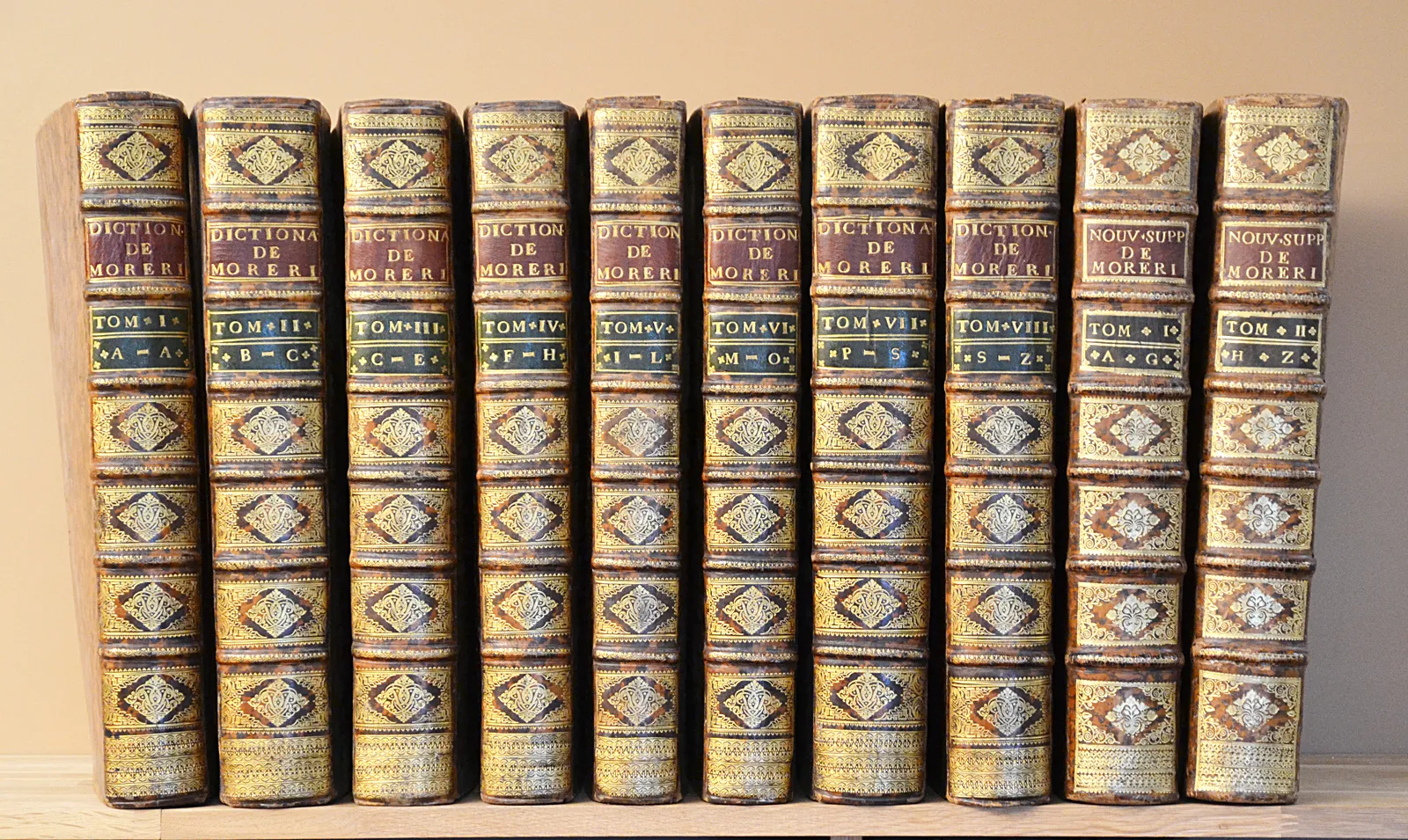 Avant dernière édition en huit volumes in-folio (+ 2 suppléments édités postérieurement) du plus fameux des dictionnaires historiques, source inépuisable et toujours recherchée tant pour l’histoire que la généalogie.