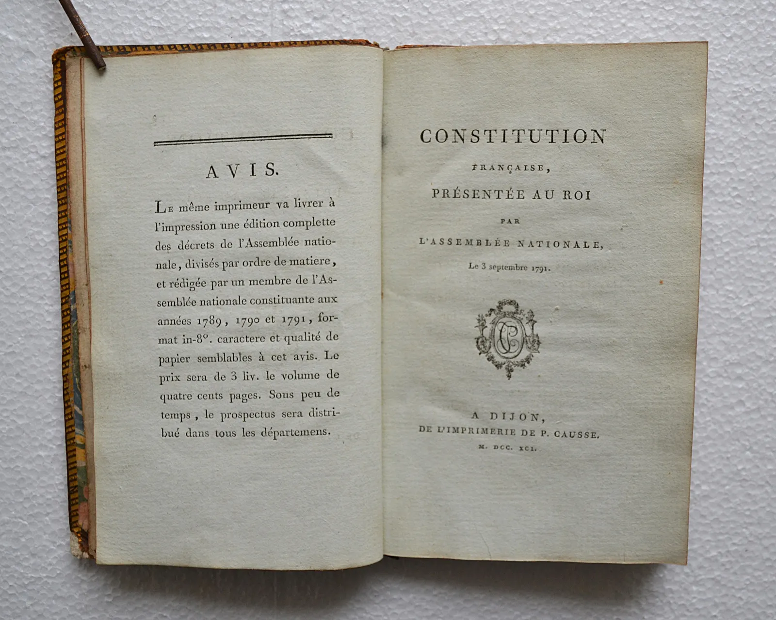 Bon exemplaire à grandes marges de la première Constitution française, imprimée à Dijon.