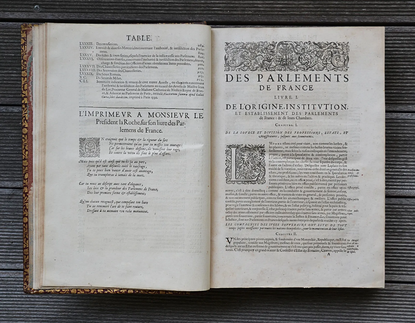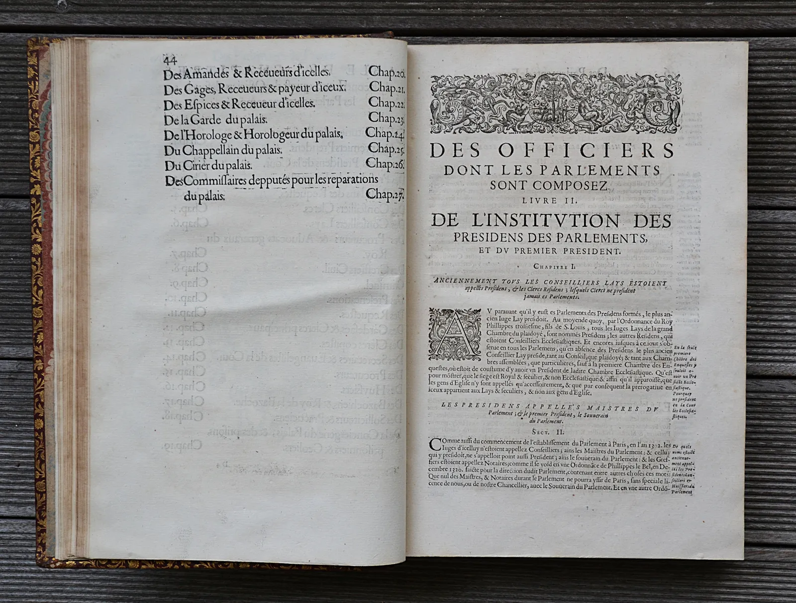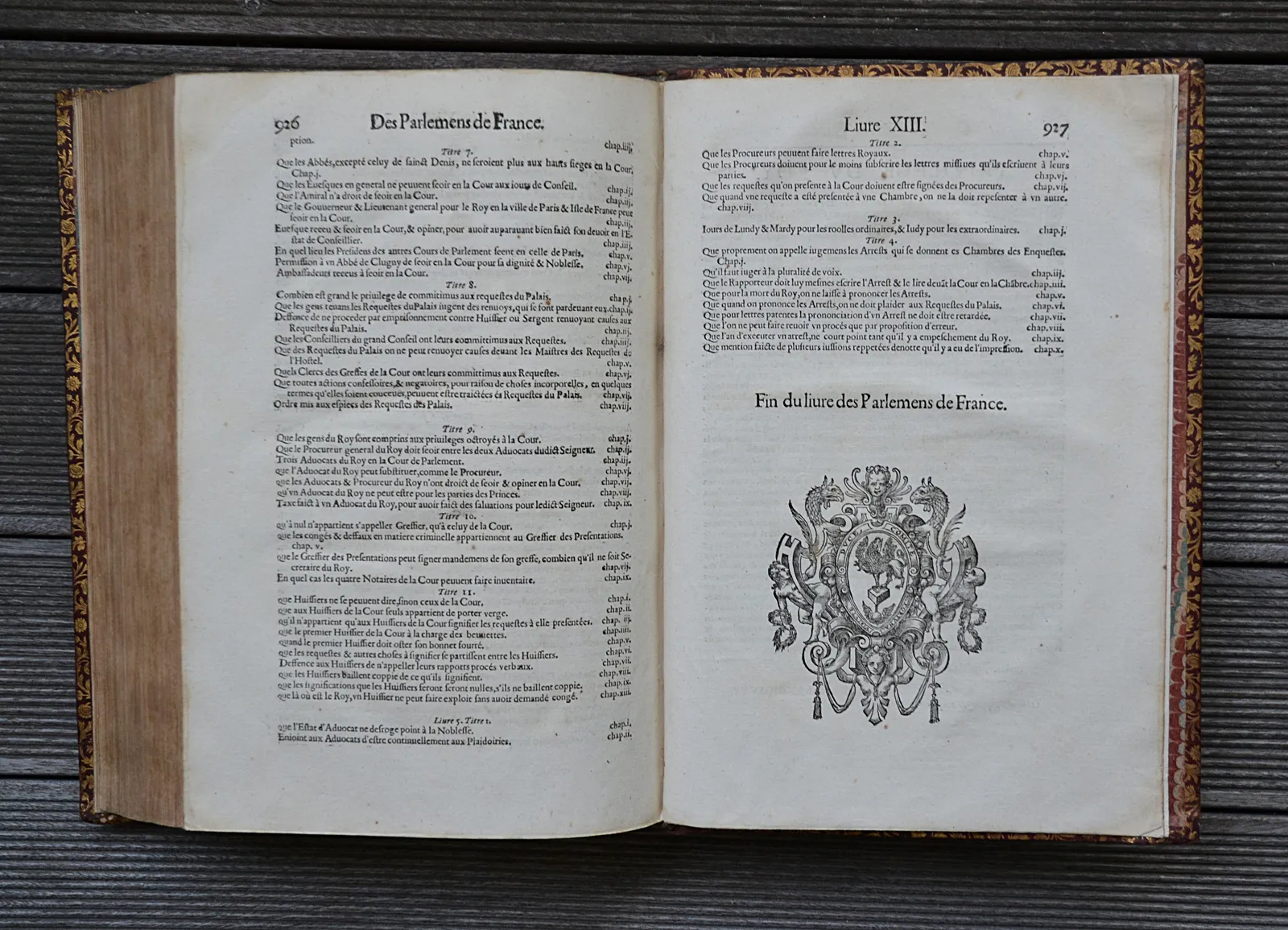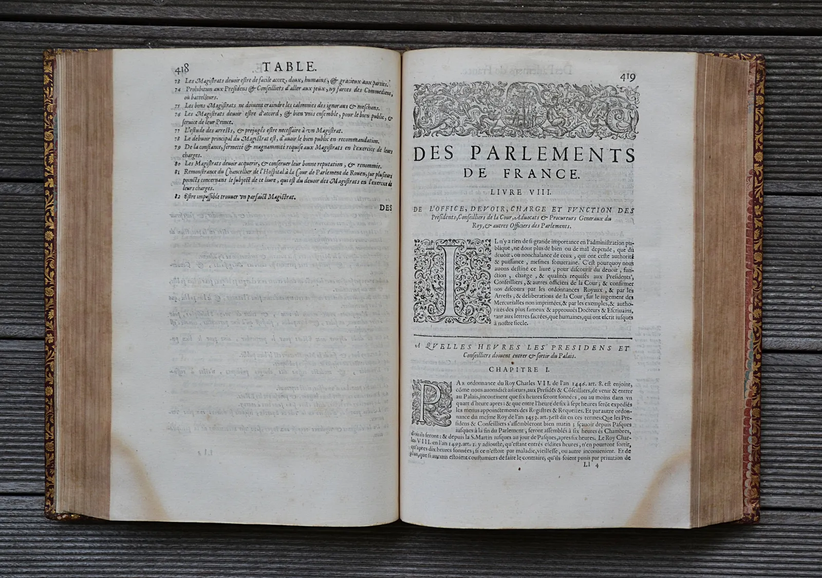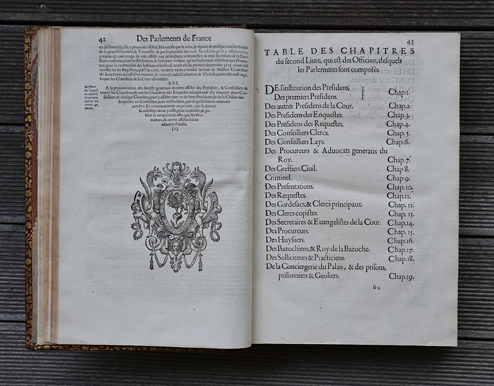 Esquels est amplement traicté de leur origine et institution, et des présidens, conseillers, gens du Roy, greffiers, secrétaires, huissiers & autres officiers ; & de leur charge, devoir, & juridiction : ensemble de leurs rangs, séances, gages, privilèges, règlements & mercurialles.