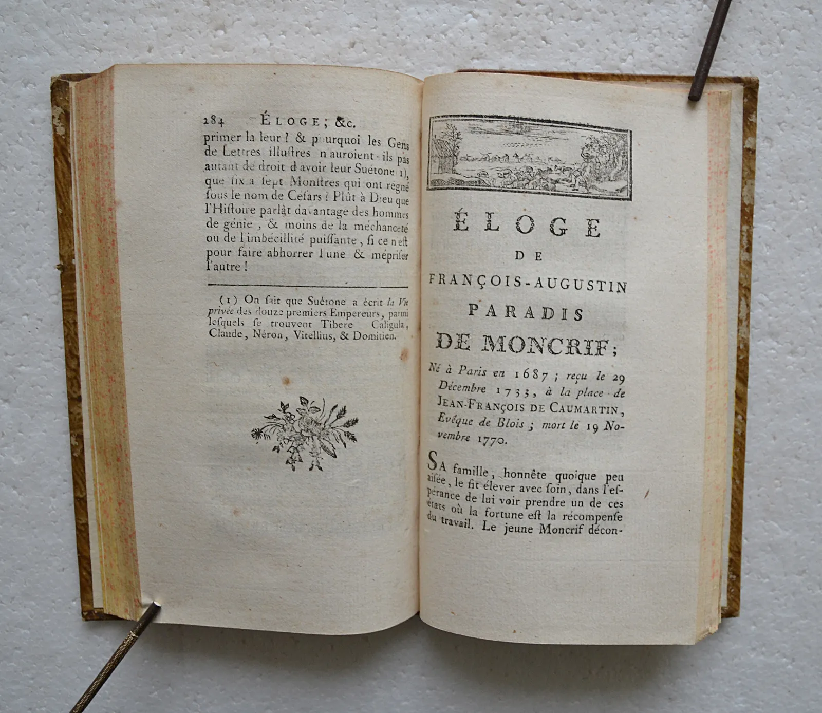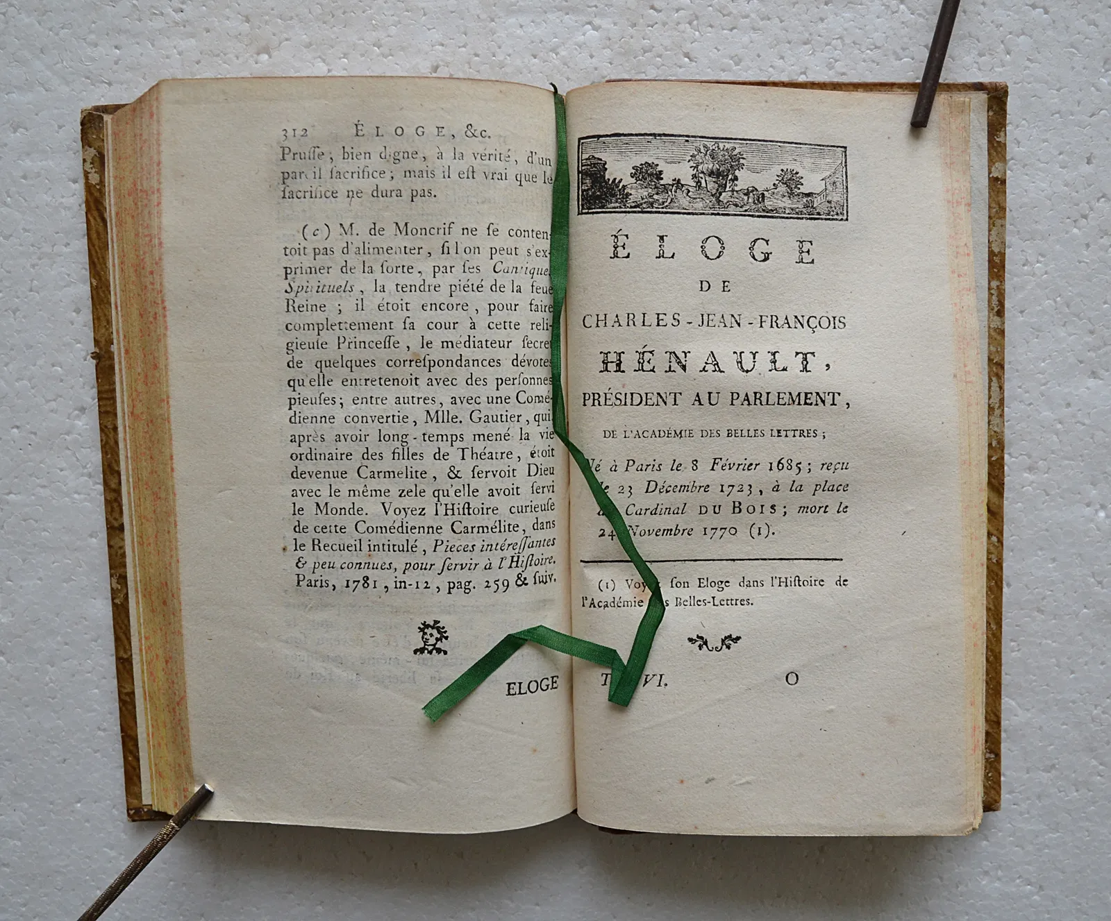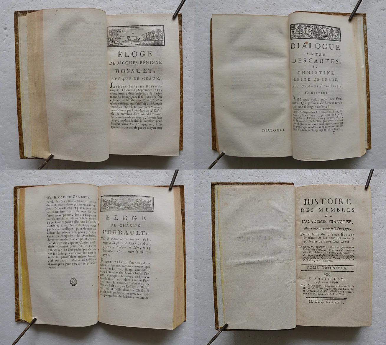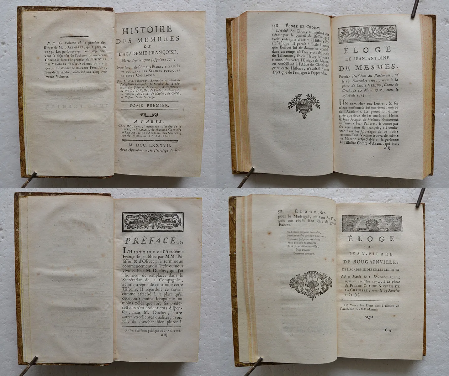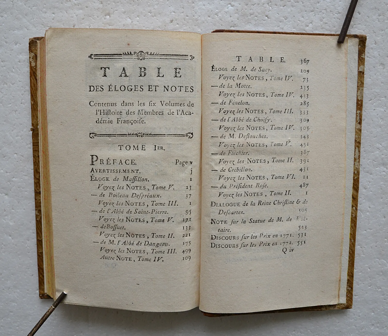 Bon exemplaire de l’édition originale collective, bien complète de la centaine de biographies des membres de l’Académie Française morts depuis 1700 jusqu’en 1771.
