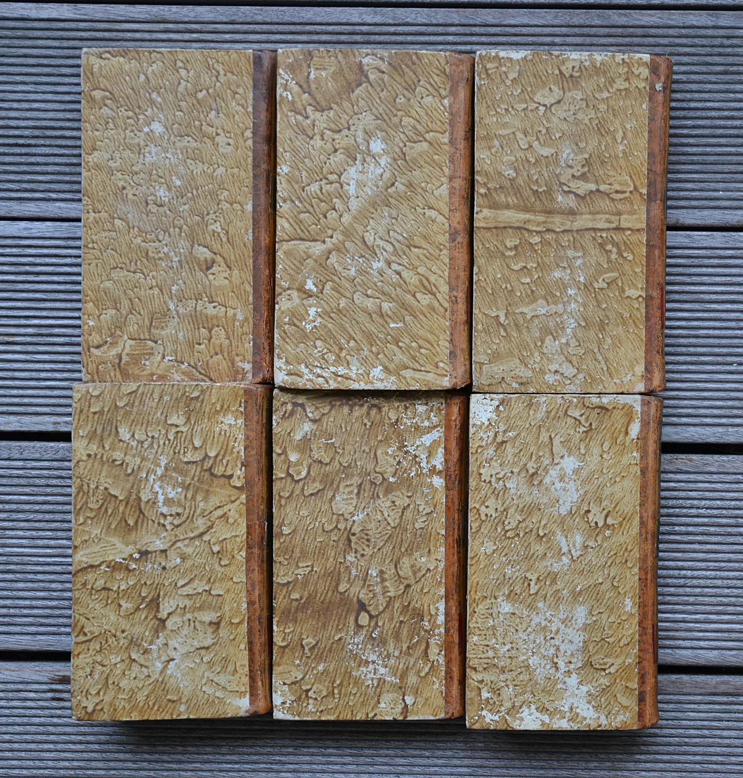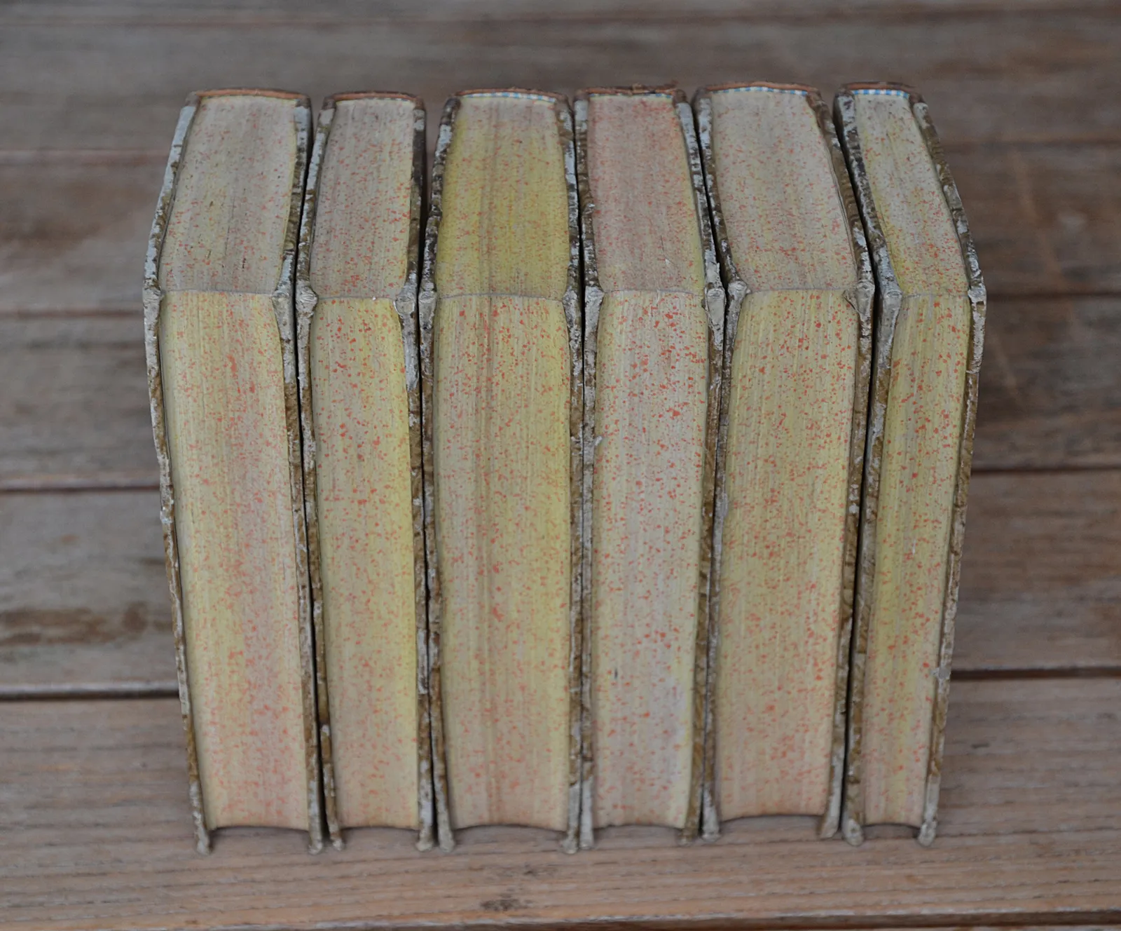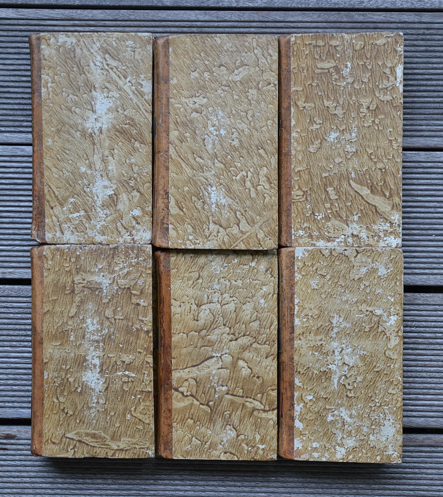 Six volumes in-8 (10,5 x 18 cm.) de XXXIV – VI – 559(1) pp. – (2ff.) + (2ff.) – XII – 437 pp. + (2ff.) – 523 pp. + (2ff.) – 637 pp. + (2ff.) – 668 pp. + (2ff.) – 378 pp. ; demi-basane havane, dos lisses ornés de filets et fleurons dorés (rosace et bateau), tranches mouchetées (reliure de l’époque).