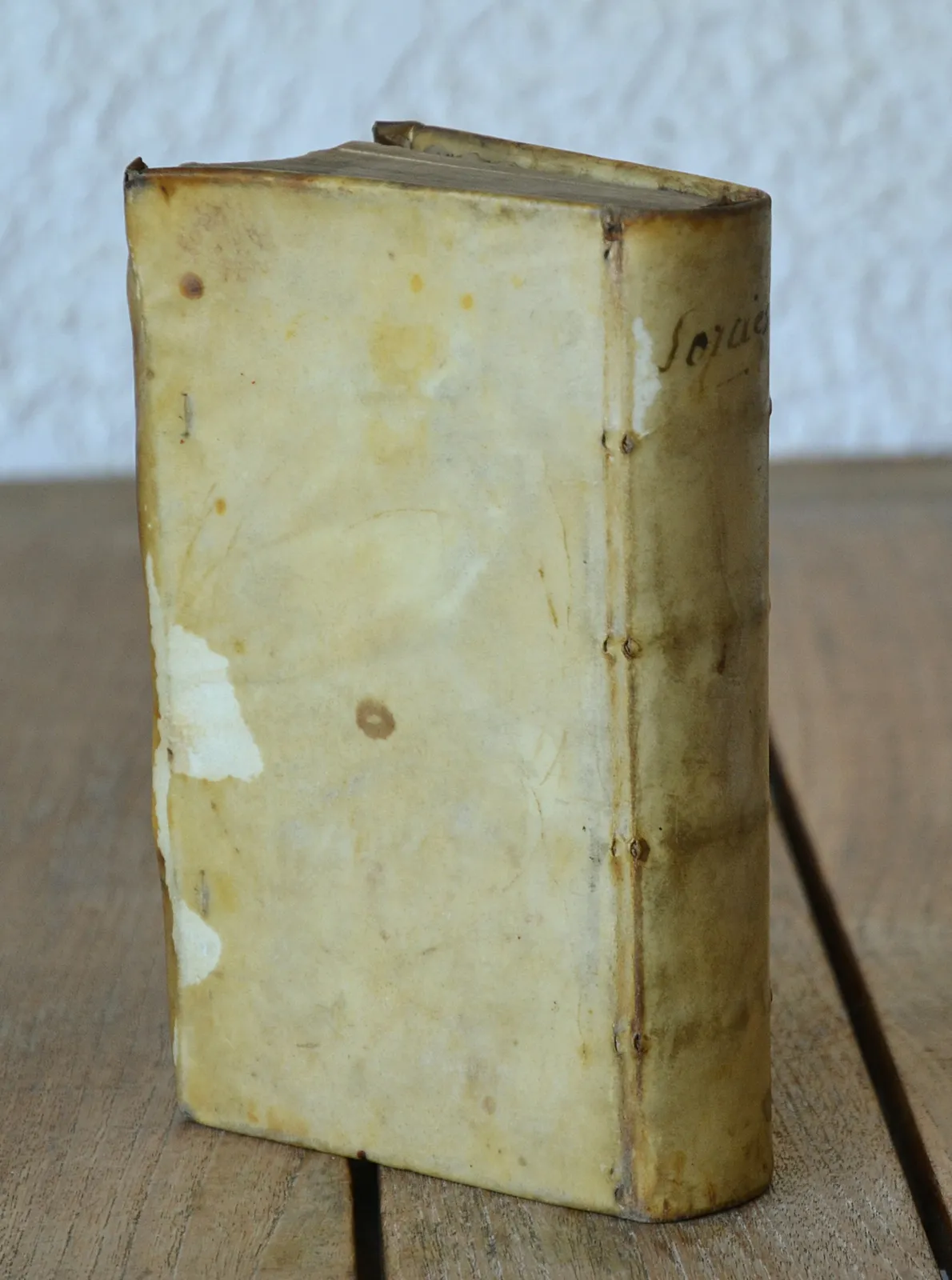 Un volume in-8 (12 x 18 cm.) de : (23ff.) – (1f. blanc) – 604 pp. – (1f.) ; vélin ivoire rigide à rabats, titre manuscrit sur le dos, attaches absentes (reliure de l’époque).