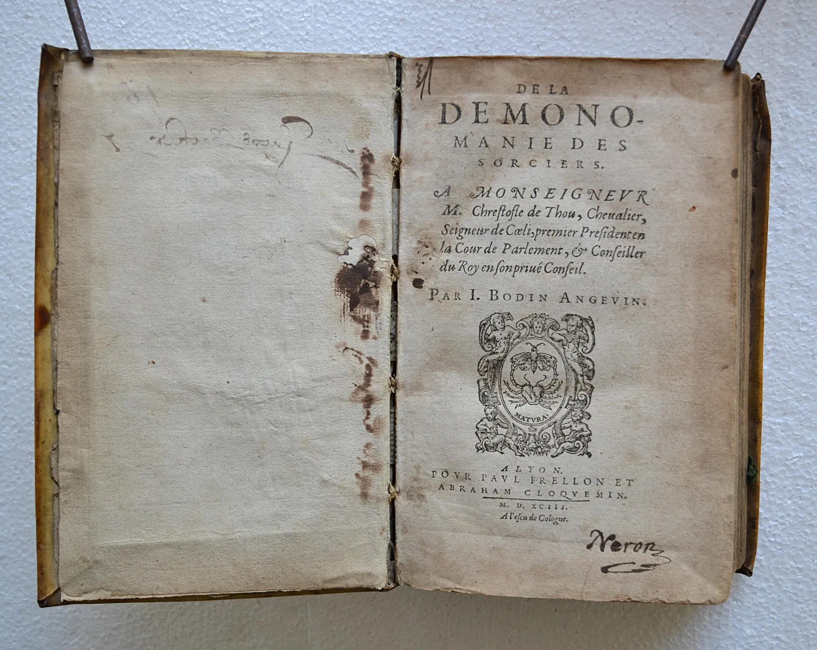 Belle et très rare impression lyonnaise du XVI° siècle, dans son vélin d’origine ; ce texte de Jean Bodin est considéré comme le meilleur ouvrage que l’on ait sur la sorcellerie.