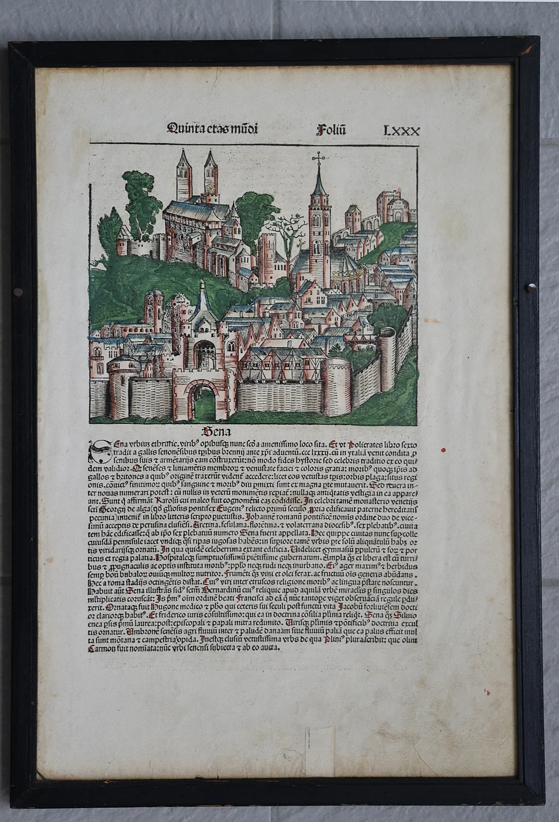 Feuillet LXXX, extrait de la Chronique de Nuremberg de 1493, avec 10 bois gravés représentant la ville de Sienne et neuf portraits peints à l’époque.