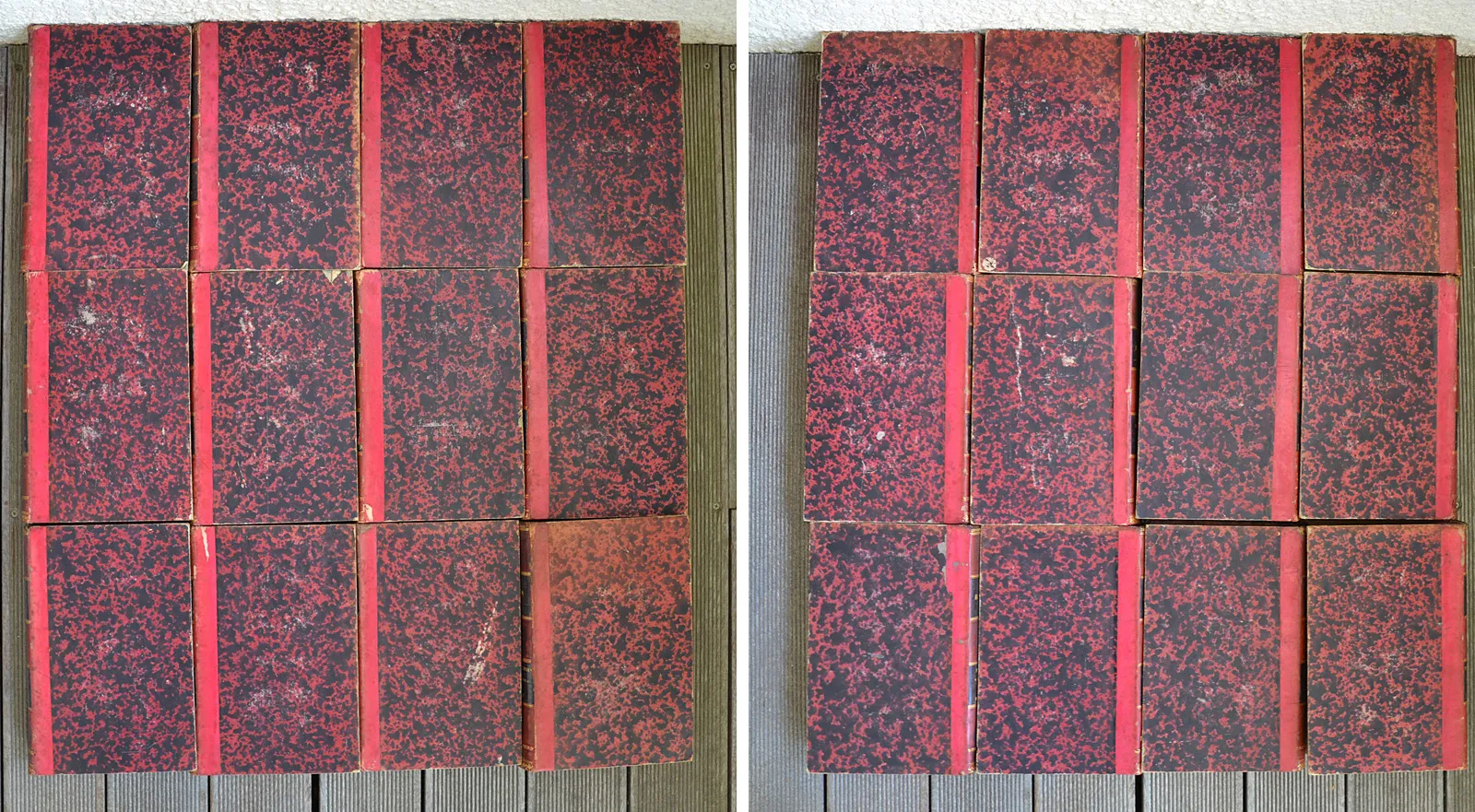 Douze volumes in-4° (19 x 27,8 cm.), demi-basane rouge, dos lisses ornés de roulettes et filets dorés, larges pièces de titre et de tomaison en veau noir (reliure de l’époque).