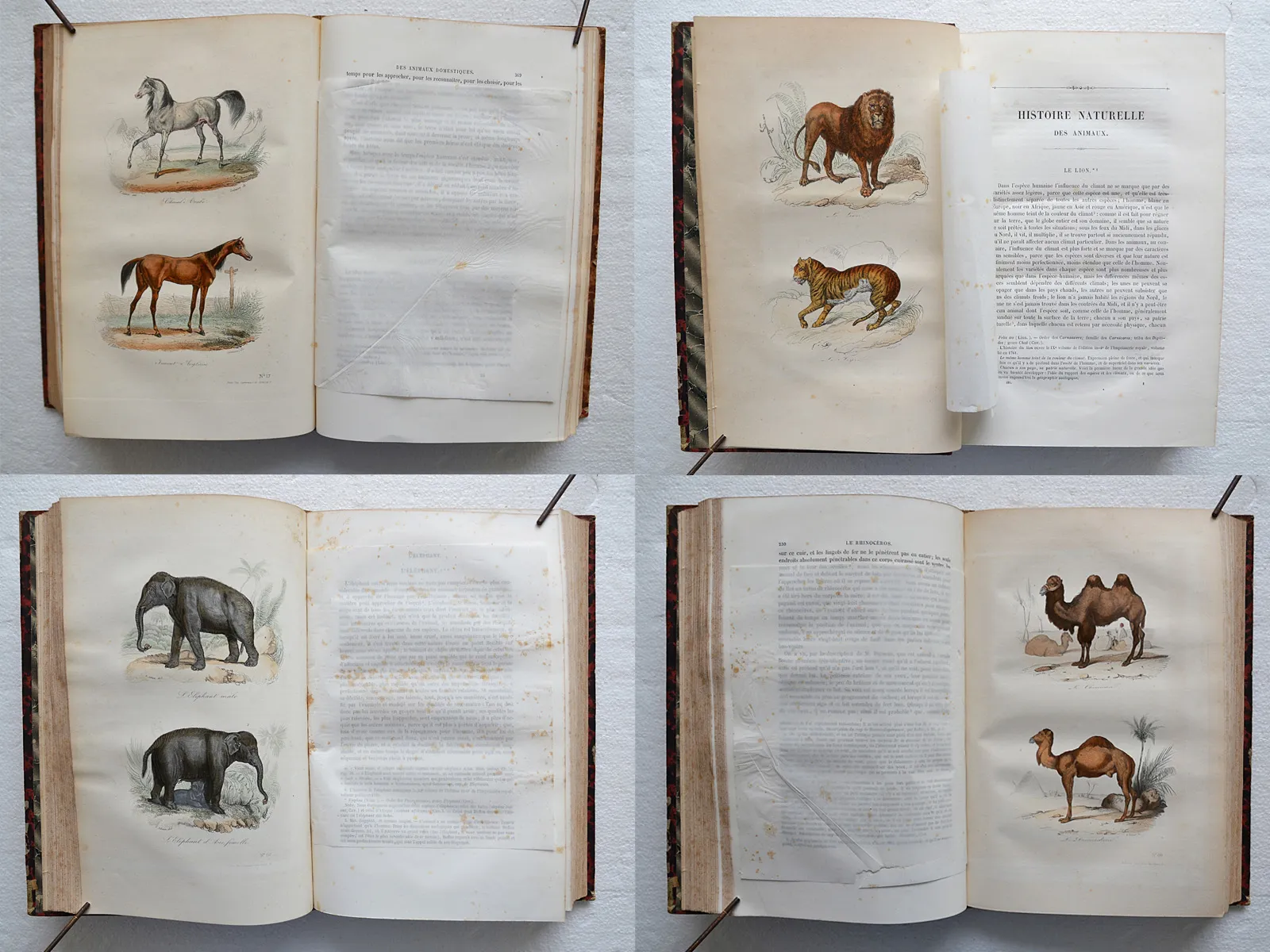 Des épidermures, des craquelures, et plusieurs accrocs sur les dos avec quelques pertes de cuir ; trois mors fendillés ; rousseurs bien présentes (quelques feuillets roussis) notamment sur les serpentes.
