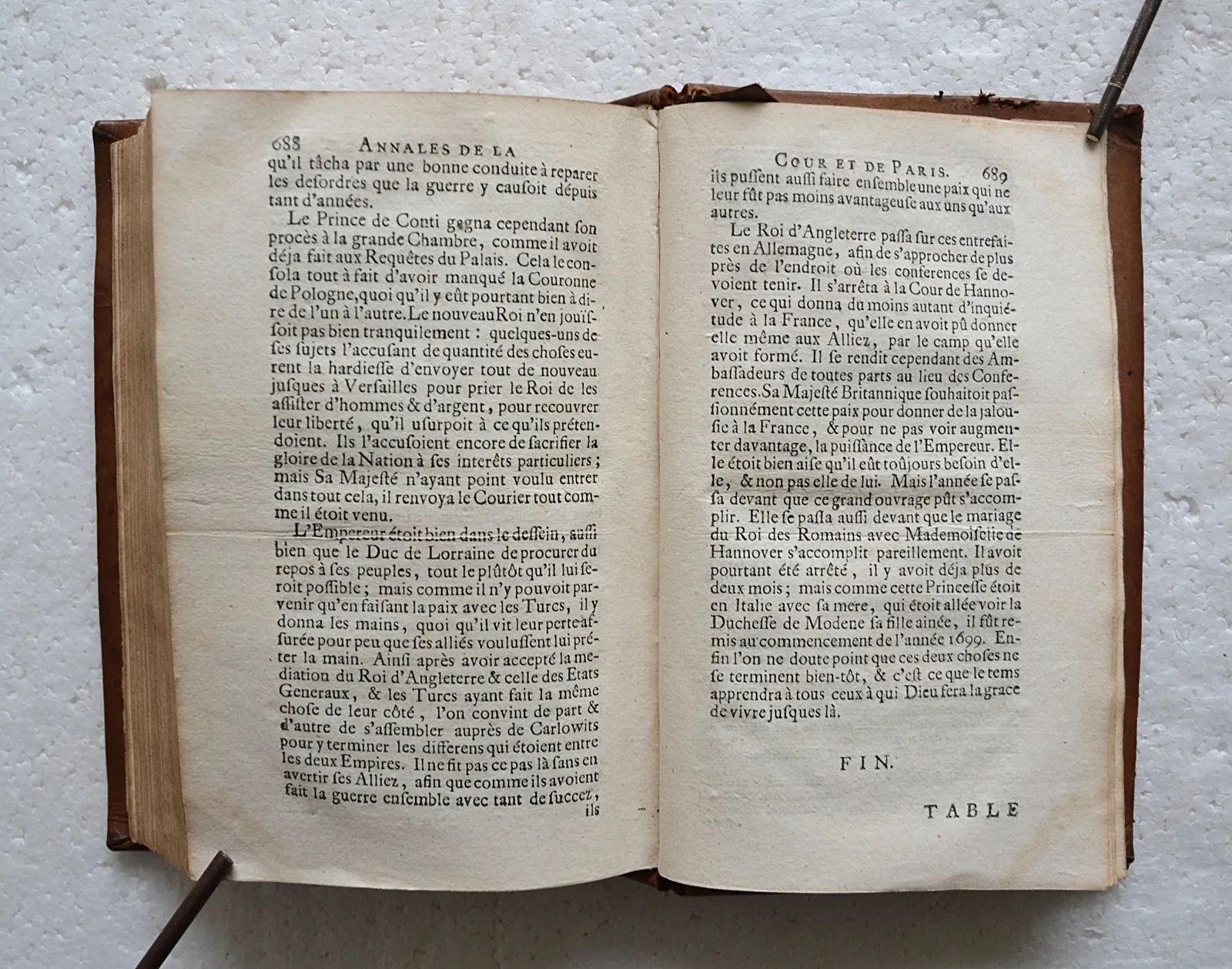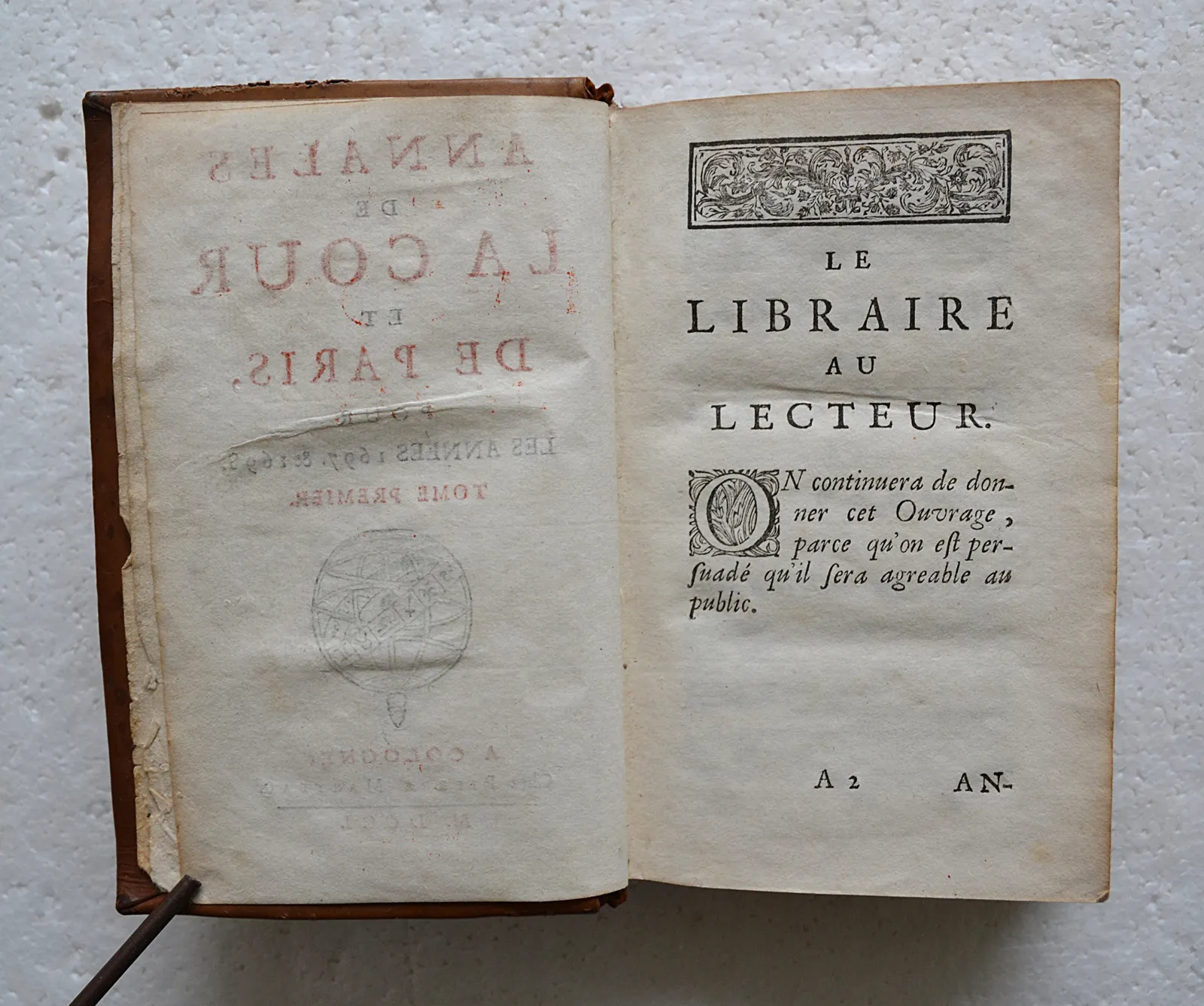 Édition originale de cet ouvrage rare, qui fut l’un des récits les plus vivants de la fin du règne de Louis XIV. D’abord mousquetaire Gatien Courtilz de Sandras quitta les armes pour vivre de sa plume. D’une rare fécondité, publiant mémoires, romans et pamphlets d’une veine picaresque et réaliste, il brave la censure par des allusions à l’actualité, et fit plusieurs séjours à la Bastille. Vivant en semi-clandestinité, il quitte la France pour ne plus être importuné par les conséquences de ses écrits. Ces Annales rassemblent, dans la veine picaresque et réaliste qui fit le succès de cet agréable conteur, de très nombreuses anecdotes et des secrets d’alcôve, de table de jeu, ou de correspondances diplomatiques. Peu après leur publication, fort d’une célébrité méritée mais peu prudente, il rentre à Paris. Il y est aussitôt arrêté et enfermé à la Bastille. Il y restera 9 longues années.