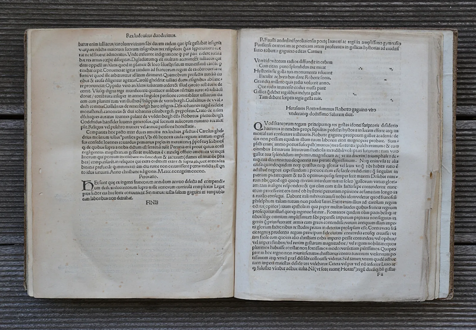 Très rare quatrième édition incunable, issue des presses parisiennes de Thielman Kerver, la dernière publiée du vivant de l’auteur, de cette grande histoire de la monarchie française, de Pharamond à Louis XII. Les épîtres rédigées par Érasme et Josse Bade, témoignent de l’importance de Gaguin, ami de Guillaume Fichet, l’introducteur de l’imprimerie en France, dans les cercles humanistes de la Renaissance.