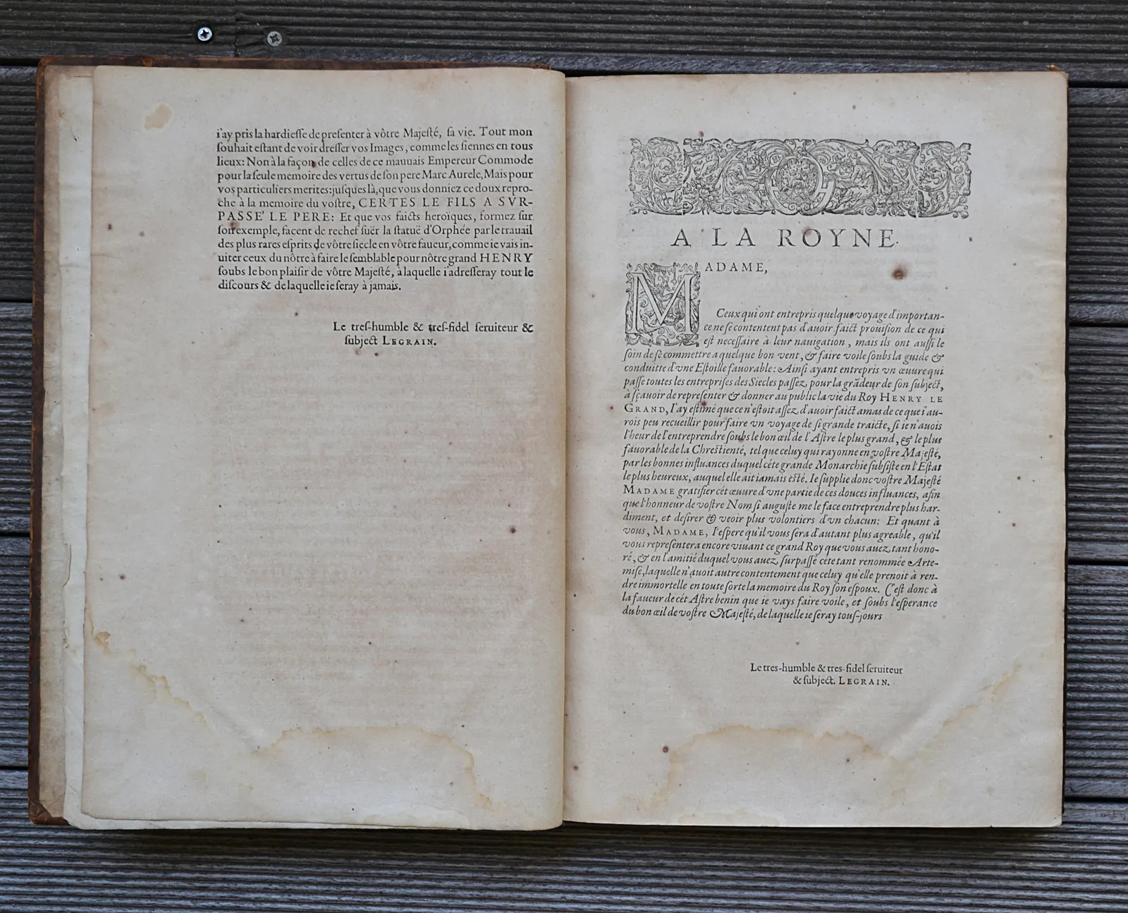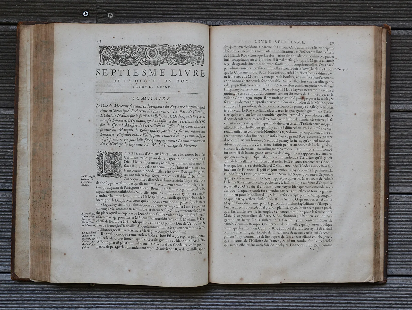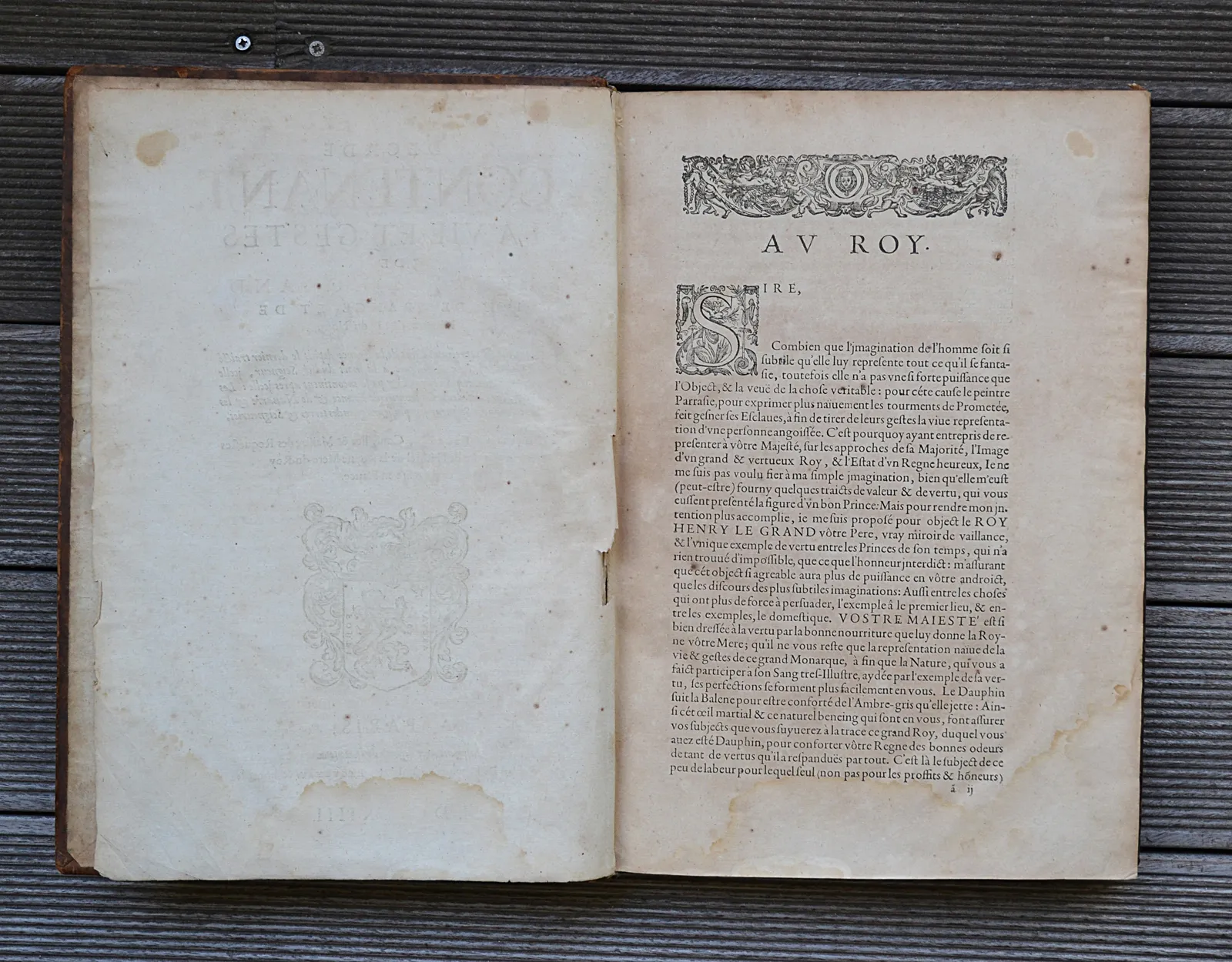 le premier plat et les trois premiers feuillets blancs sont détachés ; un mors fendillé ; épidermures et quelques accrocs, notamment sur les coiffes avec petites pertes de cuir ; des rousseurs (plusieurs pages roussies) et des traces de mouillures dans la marge inférieure de plusieurs feuillets.Il manque le portrait équestre d’Henri IV, qui doit être d’une excessive rareté, puisque nous ne l’avons rencontré dans aucun des exemplaires recensés.