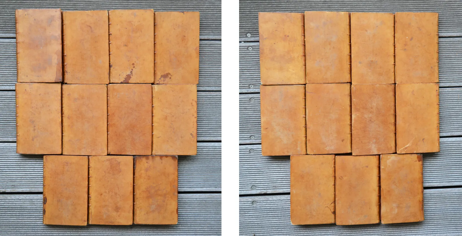 Onze volumes in-12 (10,5 x 16,3 cm.), veau blond, dos à nerfs ornés des pièces d’armes de la maison de Rohan, filet doré sur les coupes, tranches rouges (reliure de l’époque).