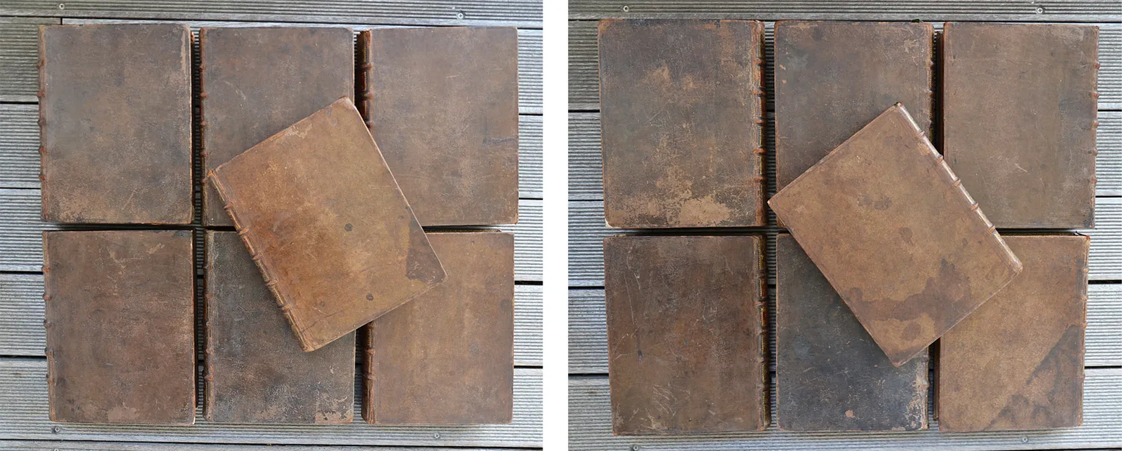 Accrocs sur quatre coiffes supérieures ; une charnière & quatre mors fendillés ; épidermures et quelques taches sur les plats ; plusieurs feuillets roussis ; galerie de ver dans la marge inférieure de 40 feuillets du T6 (sans atteinte au texte) ; coupes et coins frottés.