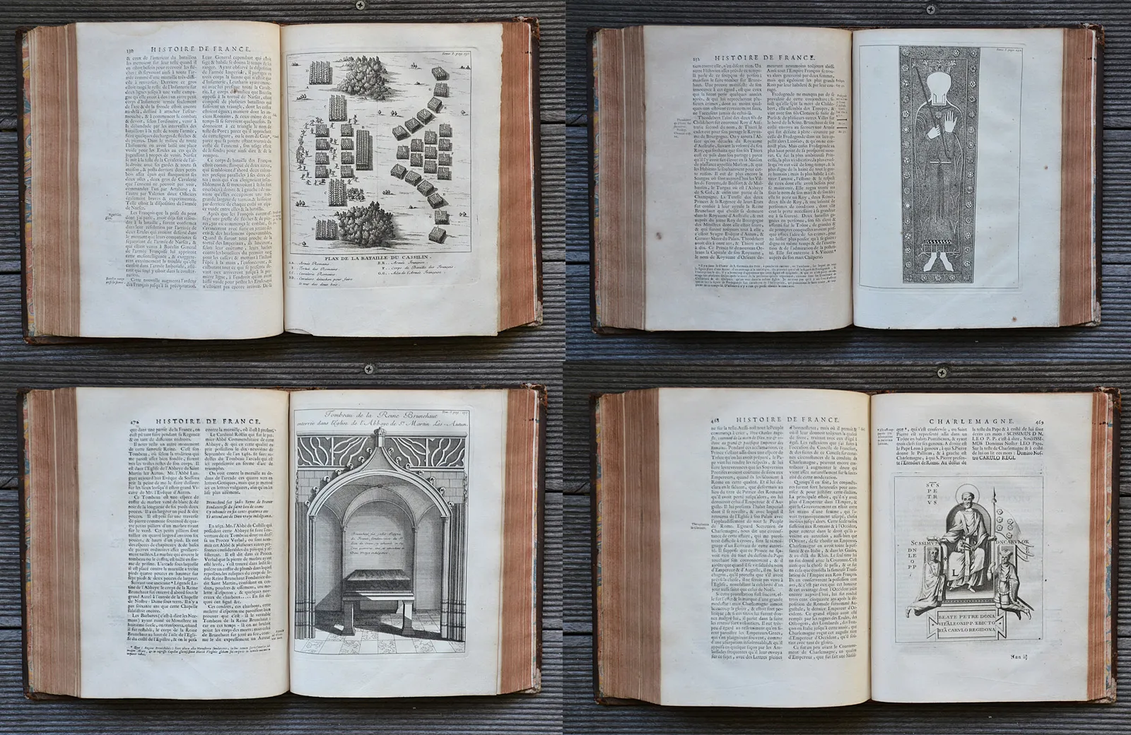 L’ouvrage est illustré d’un frontispice allégorique dessiné par Verdier, gravé par Thomassin, d’une carte dépliante, de 7 planches hors-texte, dont 2 plans dépliants, de 8 feuillets hors-texte (liste des rois de France), de 57 bandeaux gravés, et d’une trentaine de gravures dans le texte, certaines en grand format.