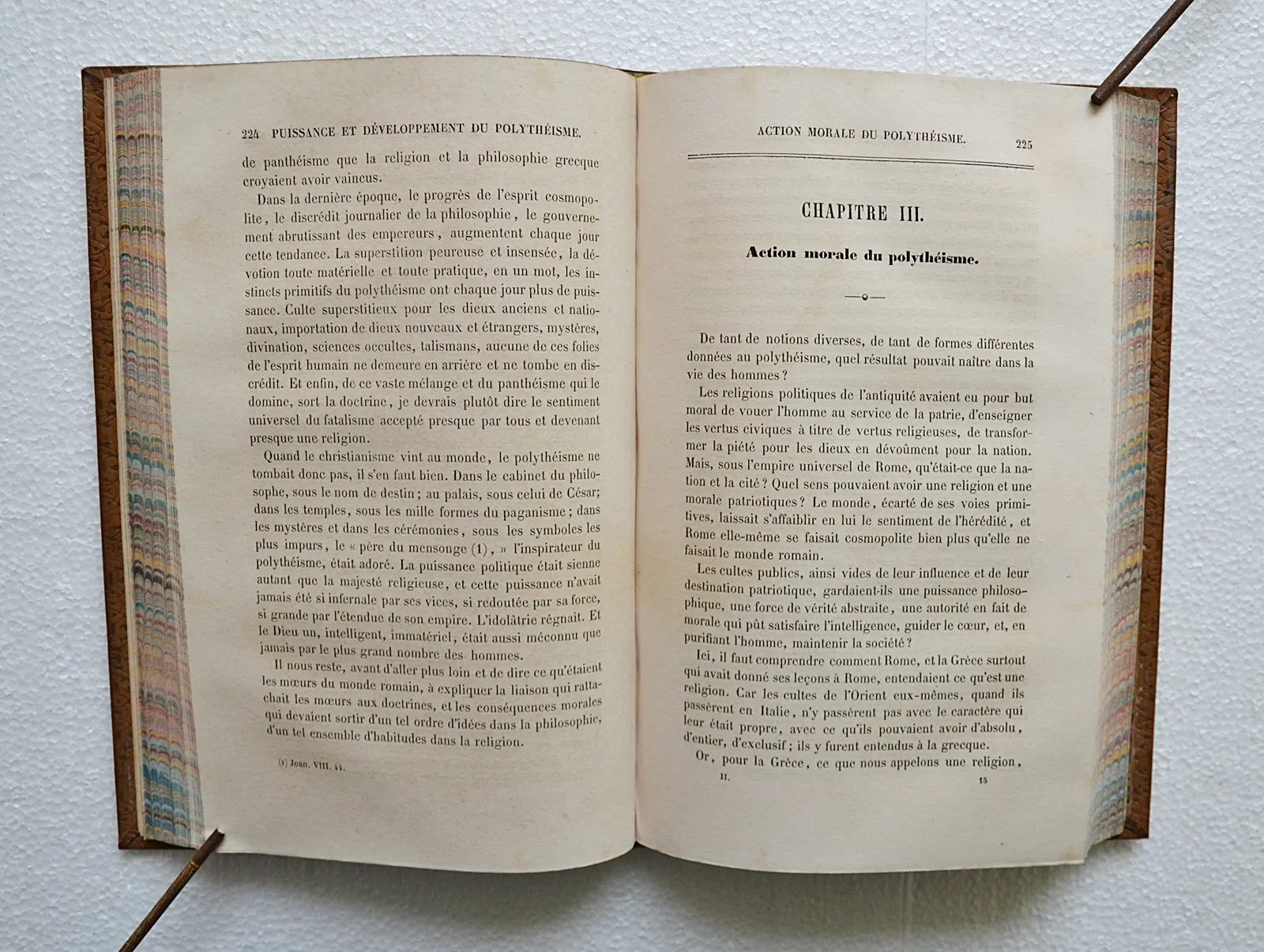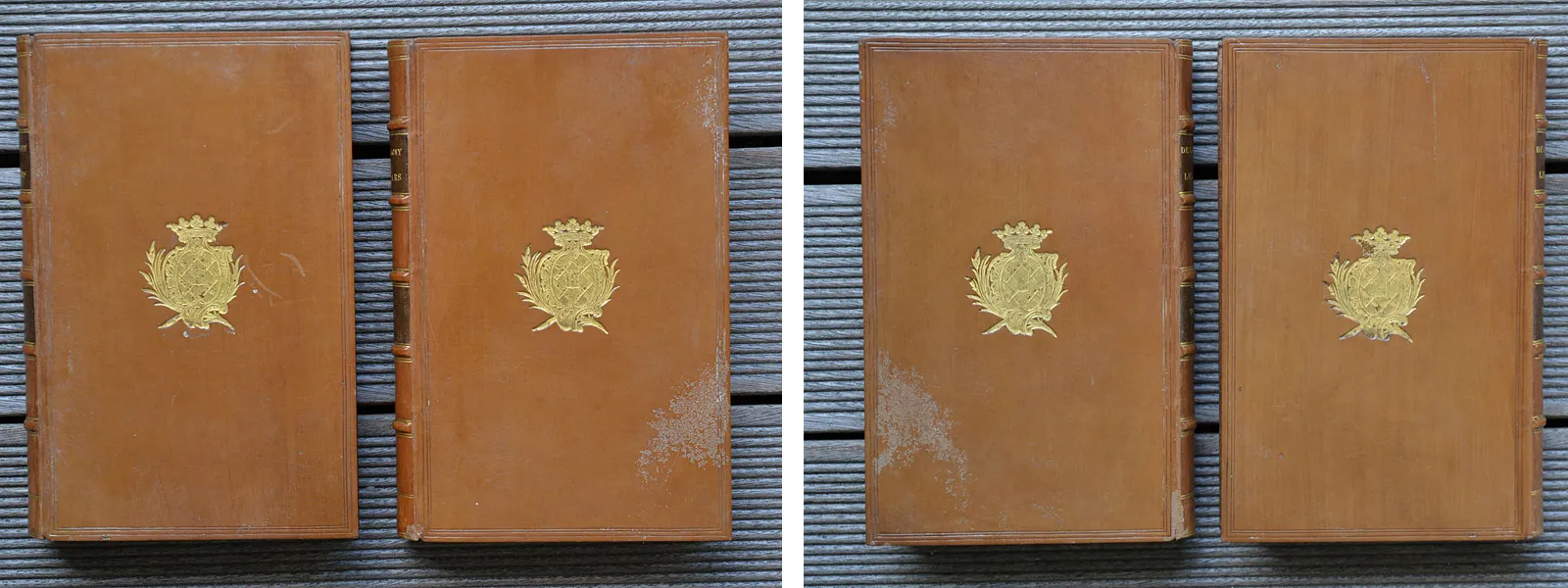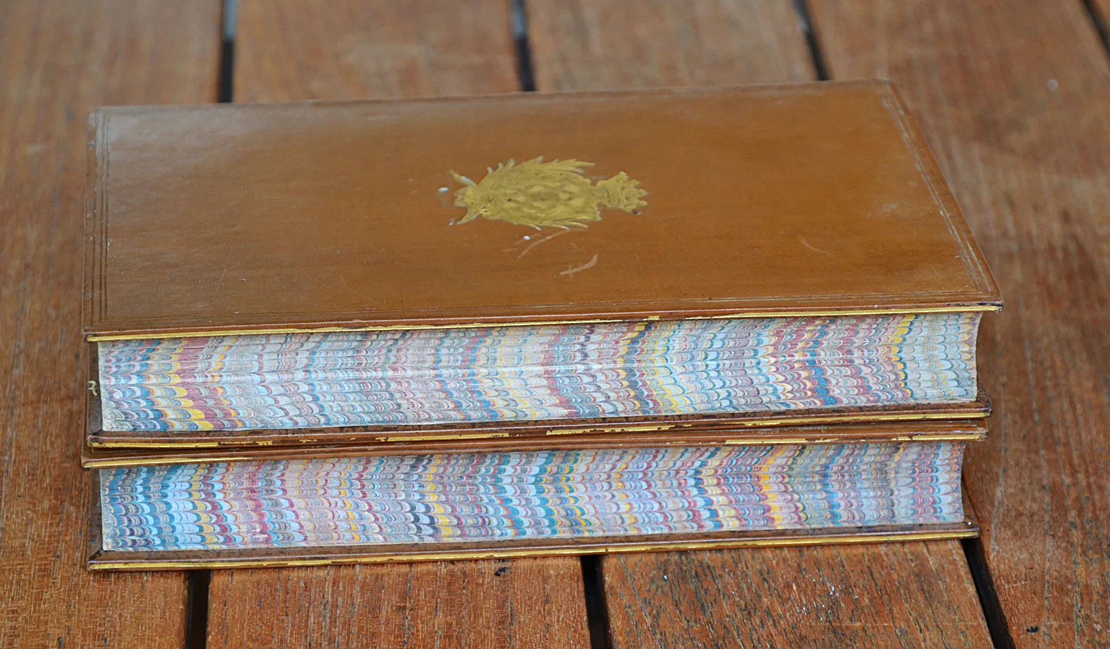 Deux volumes grands in-8 (15 x 23 cm.) de XXIII – 552 pp. + (2ff.) – 571 pp. ; veau blond glacé, armes dorées au centre des plats dans un encadrement de trois filets à froid, dos à nerfs ornés de filets dorés, filet doré sur les coupes, roulette à froid à l’intérieur, tranches marbrées (Bousquet successeur de Thomson).