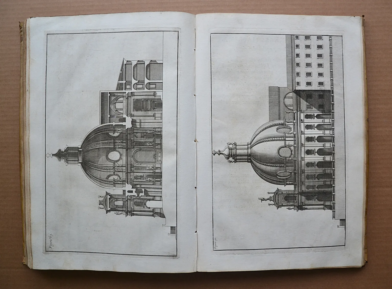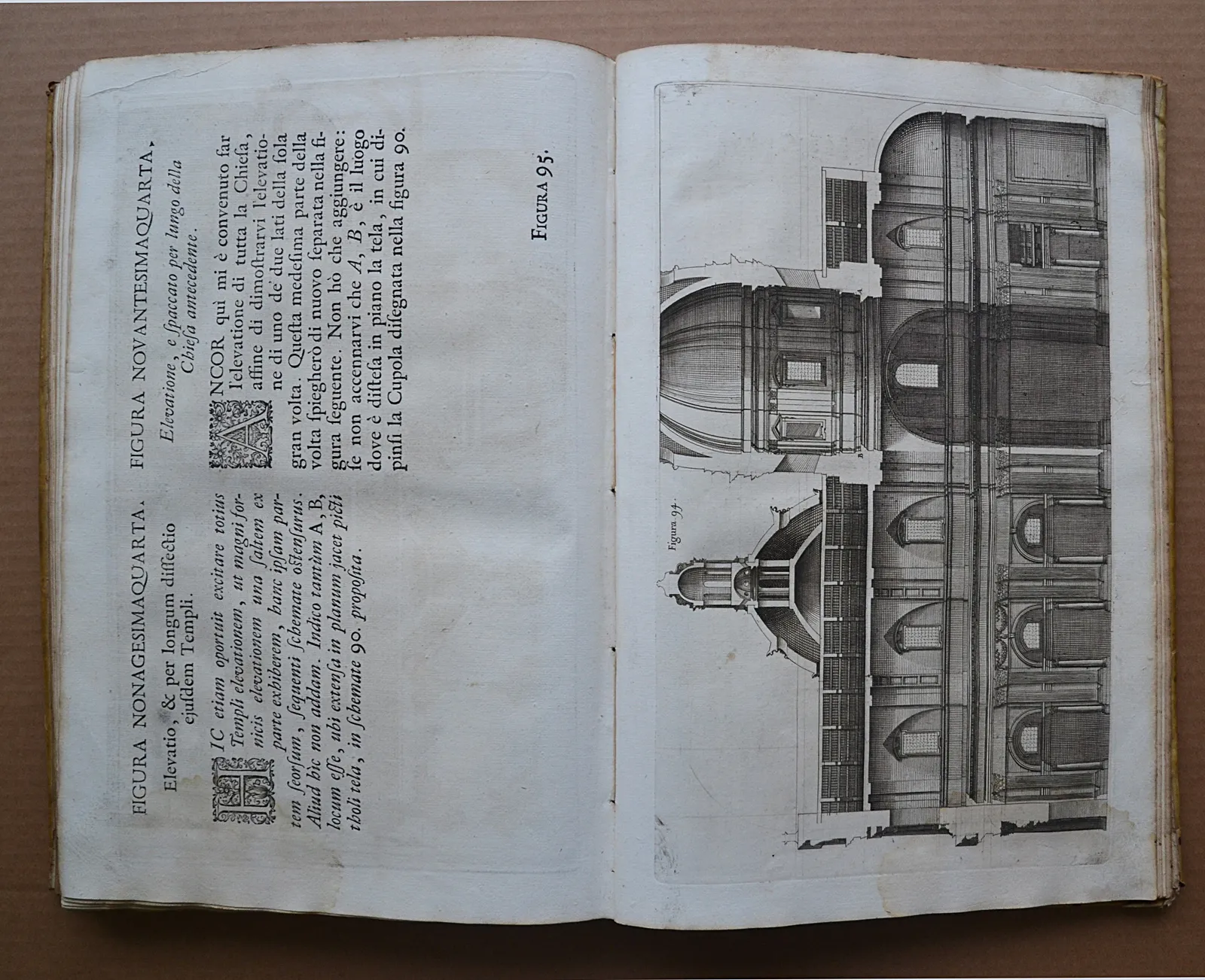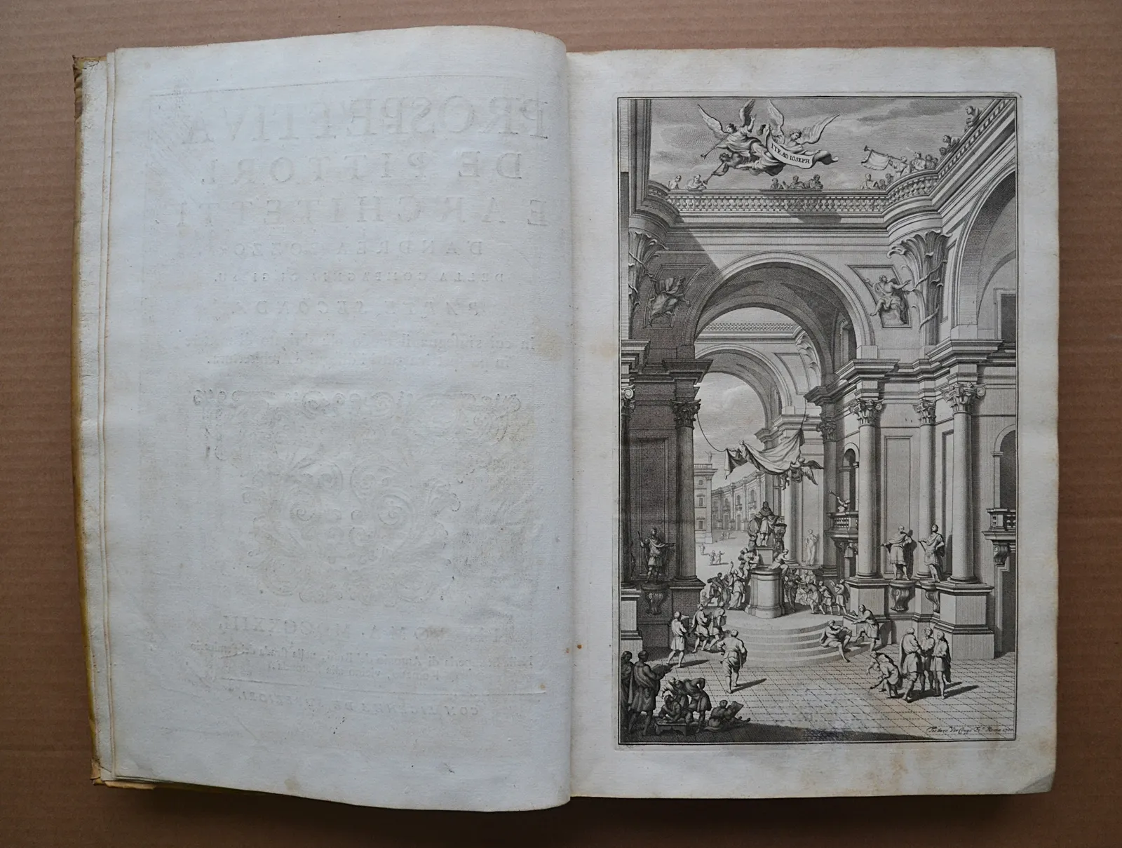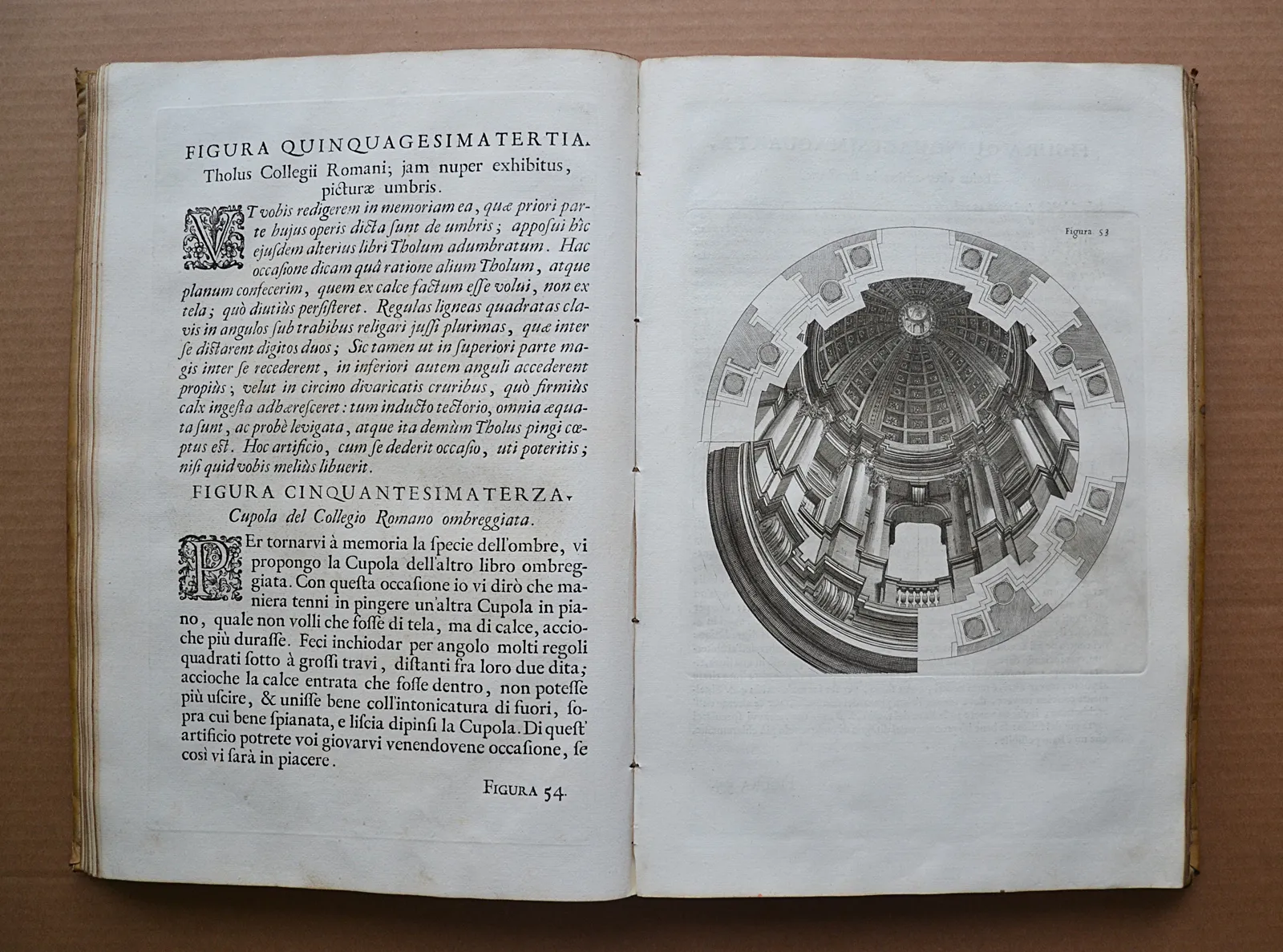 Bel exemplaire, de l’un des plus beaux traités de perspective du XVIII° siècle, composé par le peintre italien Andrea Pozzo (1642-1709). L’ouvrage paru pour la première fois en 1693 pour le premier volume et en 1700 pour le second. La première partie traite de de l’architecture, la seconde s’intéresse à la perspective dans la peinture.