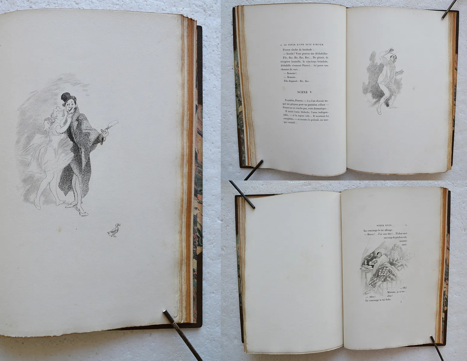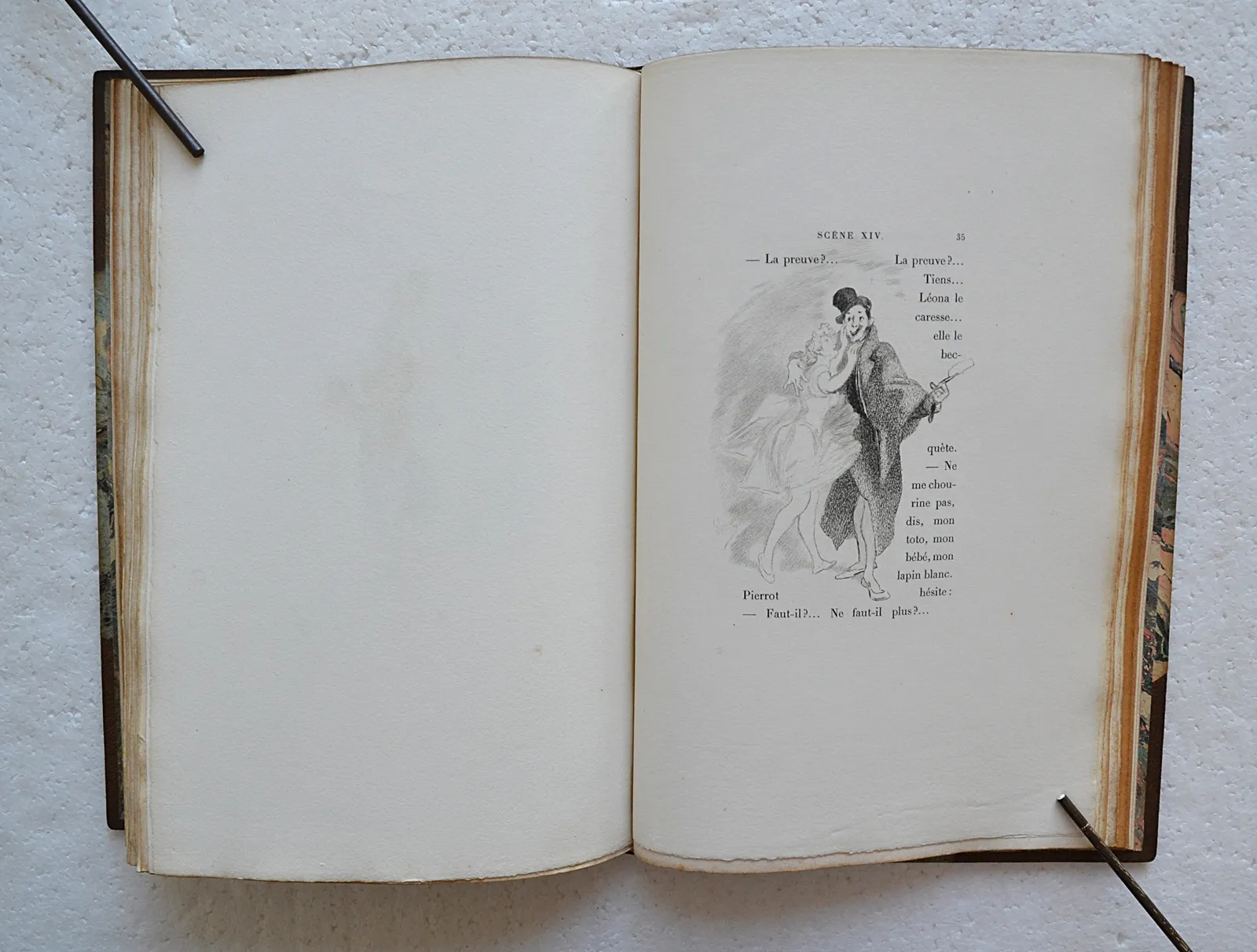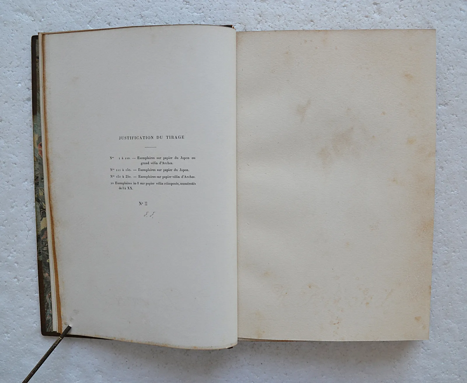 Un des 20 exemplaires sur papier vélin, in-8, réimposés, contenant les eaux-fortes en trois états, dont l’eau-forte pure et un frontispice en couleurs (n°II), au prix de 125 fr. (les exemplaires sur papier du Japon se vendant entre 25 et 65 francs et ne possèdent pas le frontispice en couleurs).