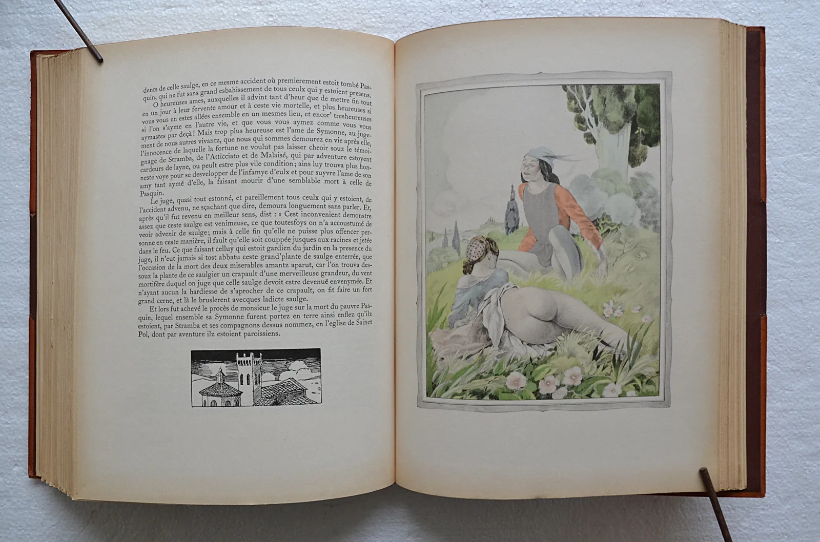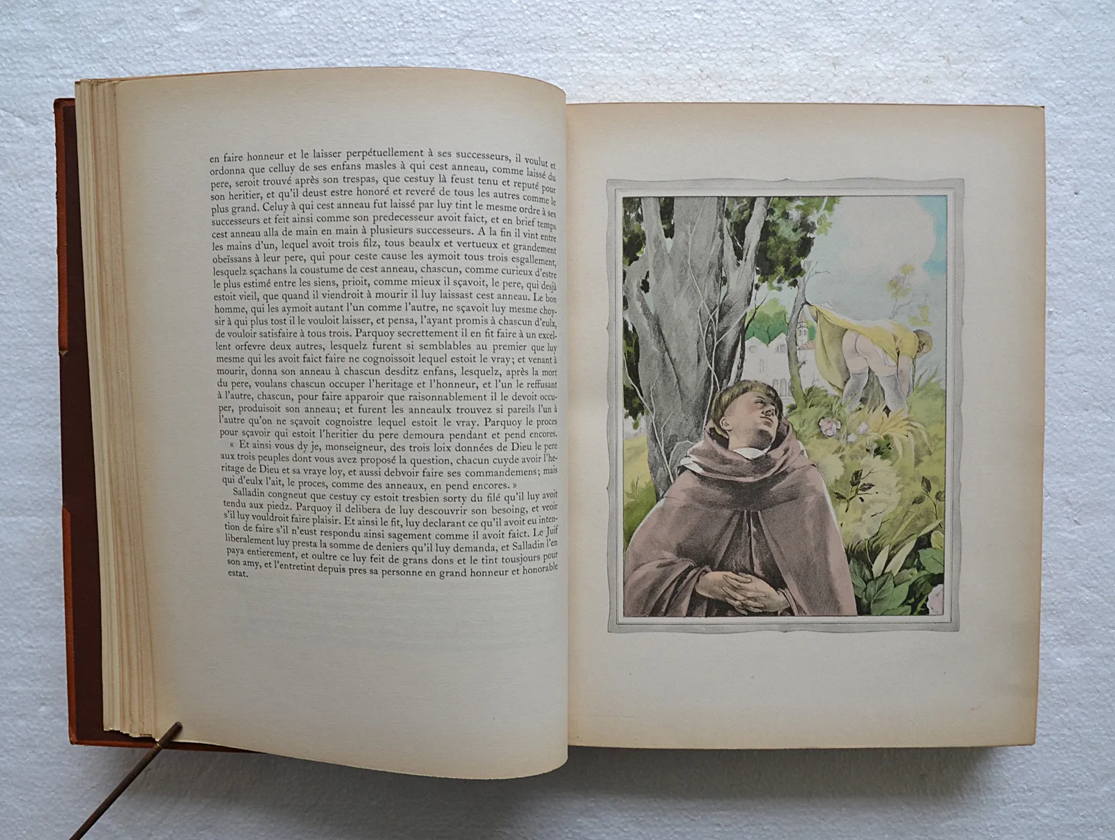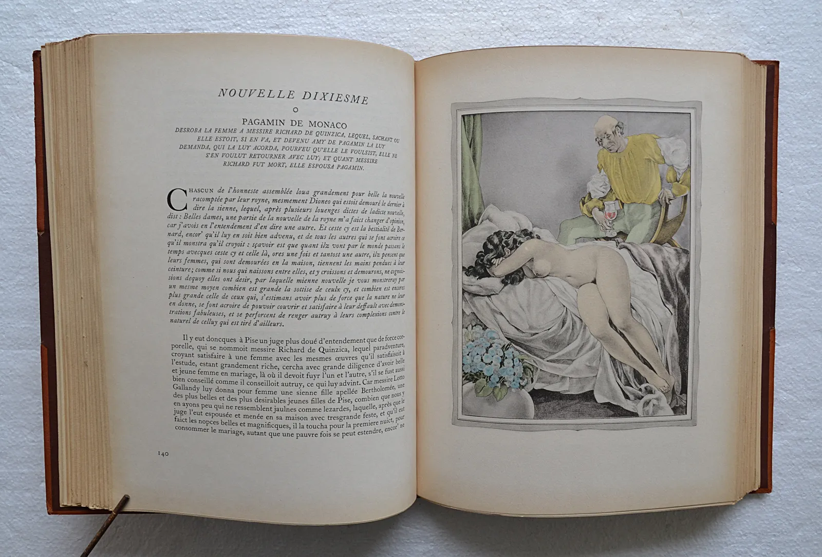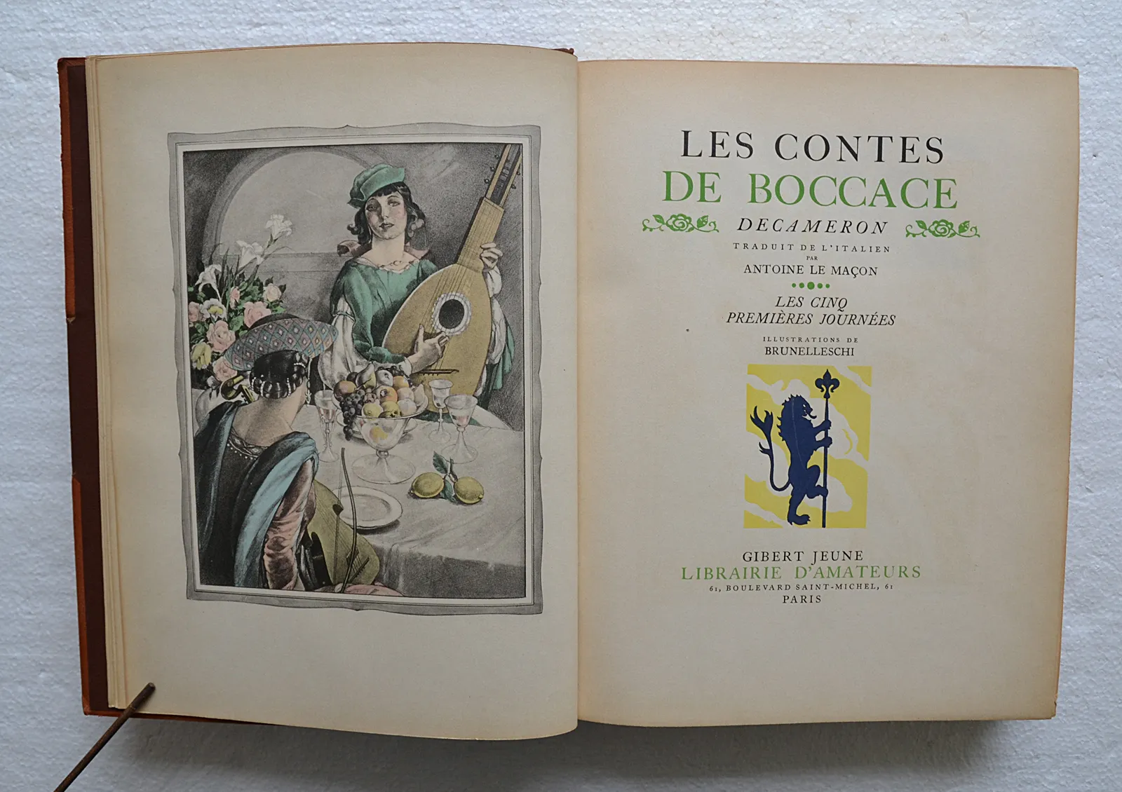 Le deuxième tirage de la présente édition des Contes de Boccace illustrés de seize hors-texte en couleurs et de soixante-dix dessins, bandeaux, lettrines, culs-de-lampe) en noir de Brunelleschi, a été limité à deux mille cinq cents exemplaires, tous numérotés (n° 1062).