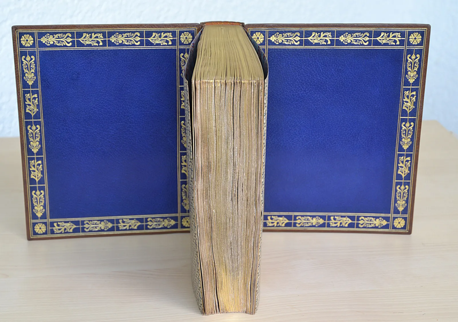 Deux volumes forts in-4 (23,5 x 28,3 cm.) de : (2ff.) – 371(1) pp. + (2ff.) – 428 pp. – (2ff.) ; maroquin havane doublé, important décor gothique à froid sur les plats et le dos avec caissons et motifs ornementaux fleuronnés, quatre dragons au centre, dos à nerfs ornés de motifs à froid (dragon, fleur), lieu et date à froid en queue, large encadrement doré à l’intérieur, doublure en maroquin bleu, tranches dorées, couverture conservée (P.R. Raparlier).