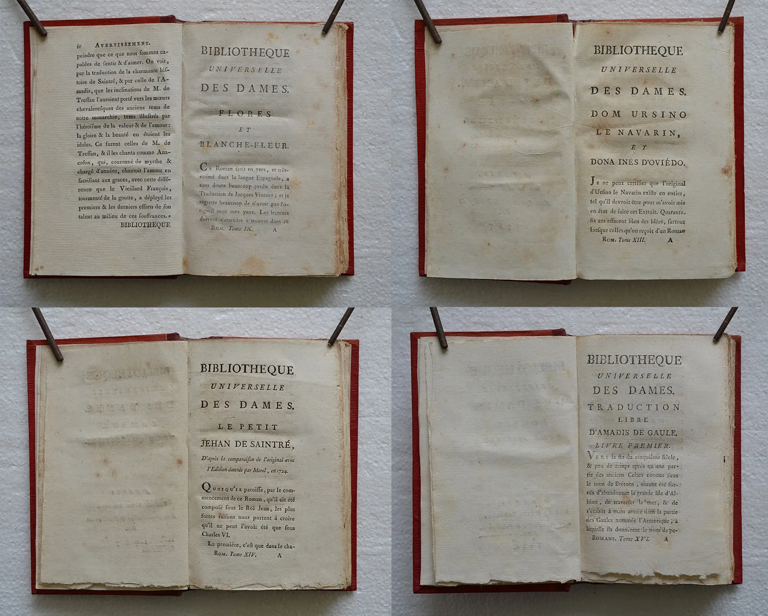 T1 – T2 – T3 : Amours de Théagenes et Clariclée – (XII + 300 pp.) + 303 pp. + 316 pp.T4 : Amours d’Ismène et d’Isménias / Daphnis y Chloé – 430 pp.T5 : Amours de Clitophon y Leucippe – (V + 346 pp.)T6 : Du vrai et parfait amour / Chereas y Callirhoea – 269 pp.T7 : Chéréas y Callirhoé – 314 pp.T8 : Amours de Rhodante et Dosíclès / Larisse, histoire grecque / D’Anasilis et Mysiclée / Charmus, Élise, et Thersandre / Euphrosie – 256 pp.T9 : Flores et Blanche-Fleur / Cléomades et Claremonde / Pierre de Provence – 286 pp.T10 : Tristan de Léonois / Artus de Bretagne – 293 pp.T11 : La Fleur des Batailles – 278 pp.T12 : Huon de Bordeaux / Guerin de Montclave – 409 pp.T13 : Dom Ursino le Navarin, et Dona Inés d’Oviédo – 291 pp.T14 : Le petit Jehan de Saintré – 245 pp.