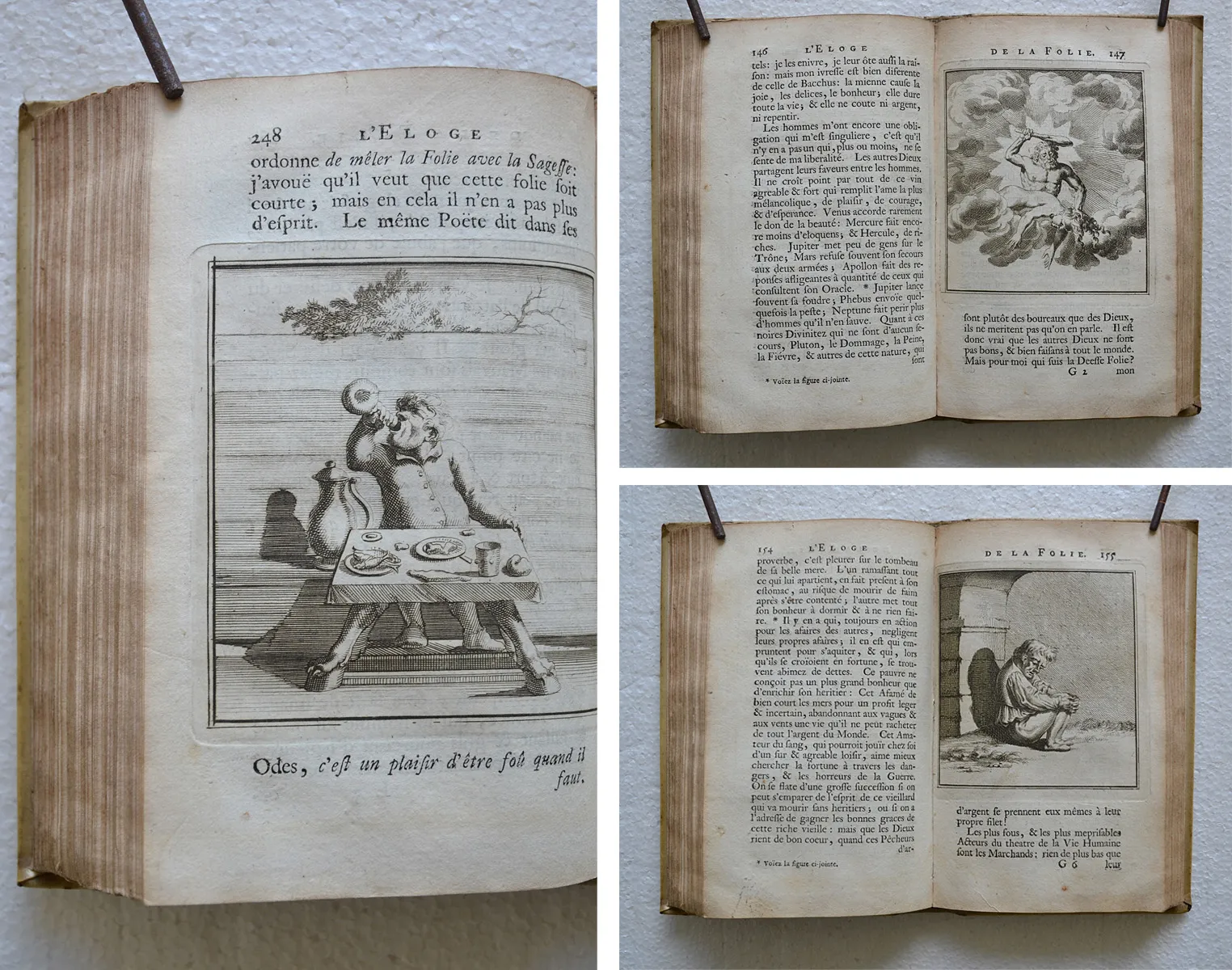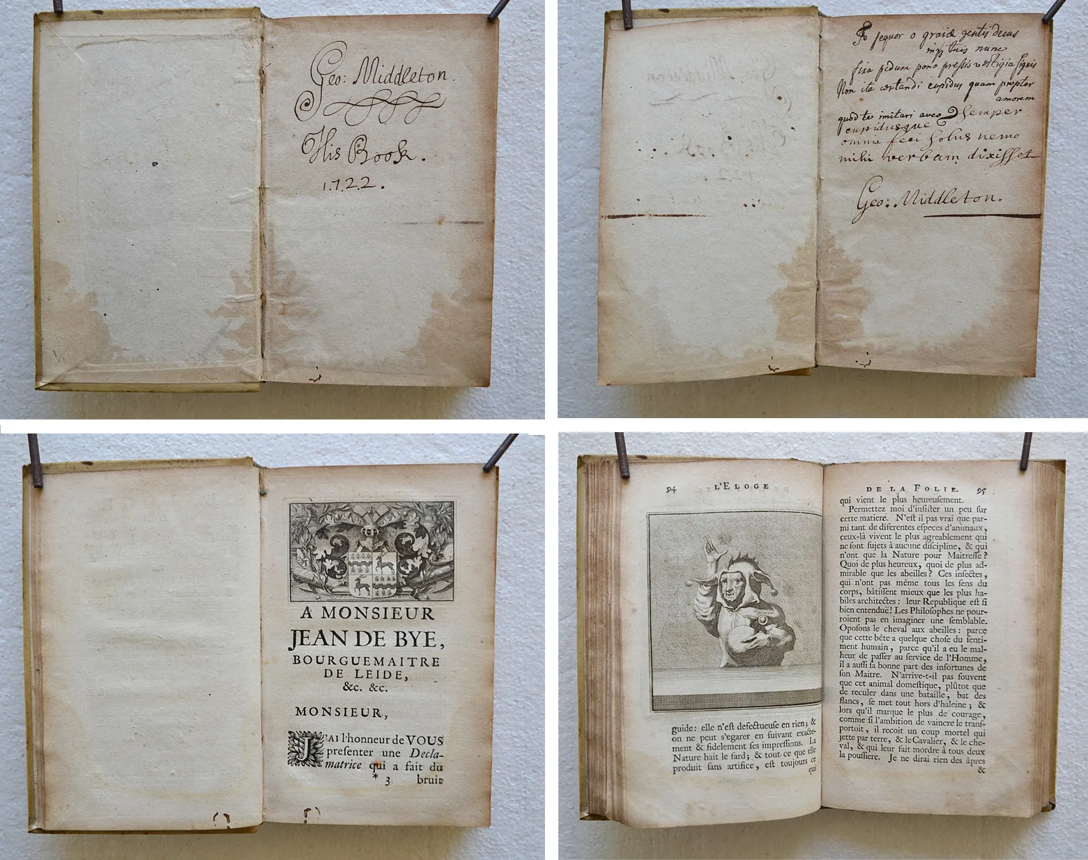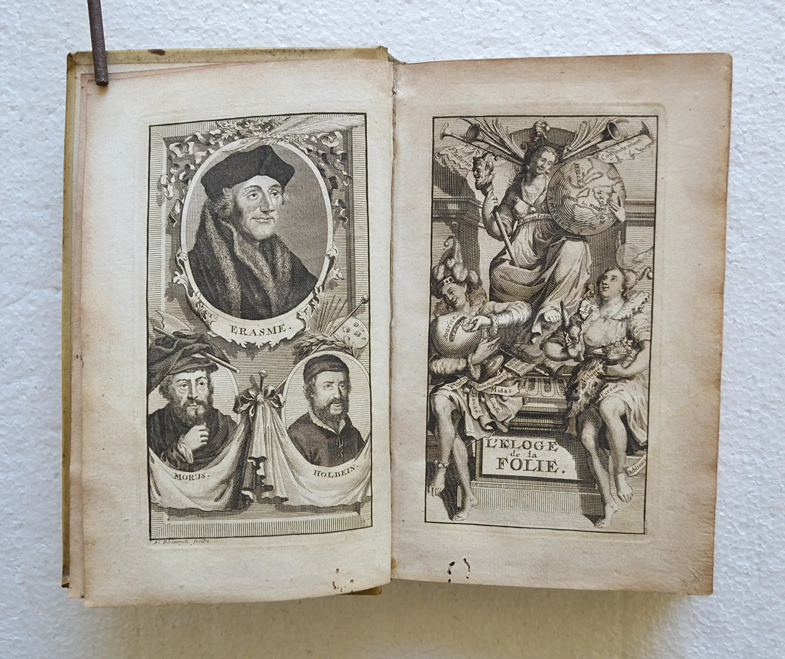 Première édition de cette traduction due à Nicolas Gueudeville (1652-1721, moine bénédictin défroqué converti au calvinisme, historien et pamphlétaire) ; et premier tirage des figures gravées d’après Holbein. L’illustration entièrement gravée sur cuivre se compose d’une planche représentant les portraits d’Érasme, d’Holbein et de Thomas More, d’un frontispice allégorique, de 75 vignettes dans le texte et de 5 planches dépliantes (sur 6) d’après les dessins d’Holbein. Armes de Jean de Bye, bourgmestre de Leyde, gravées sur cuivre en tête de la dédicace.