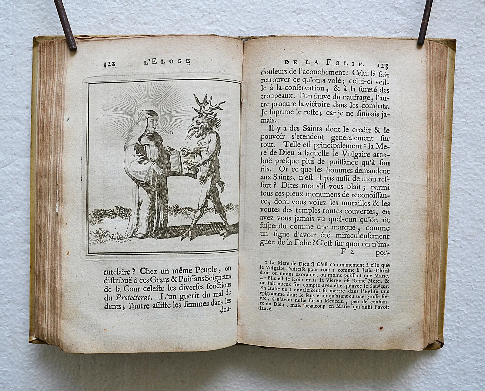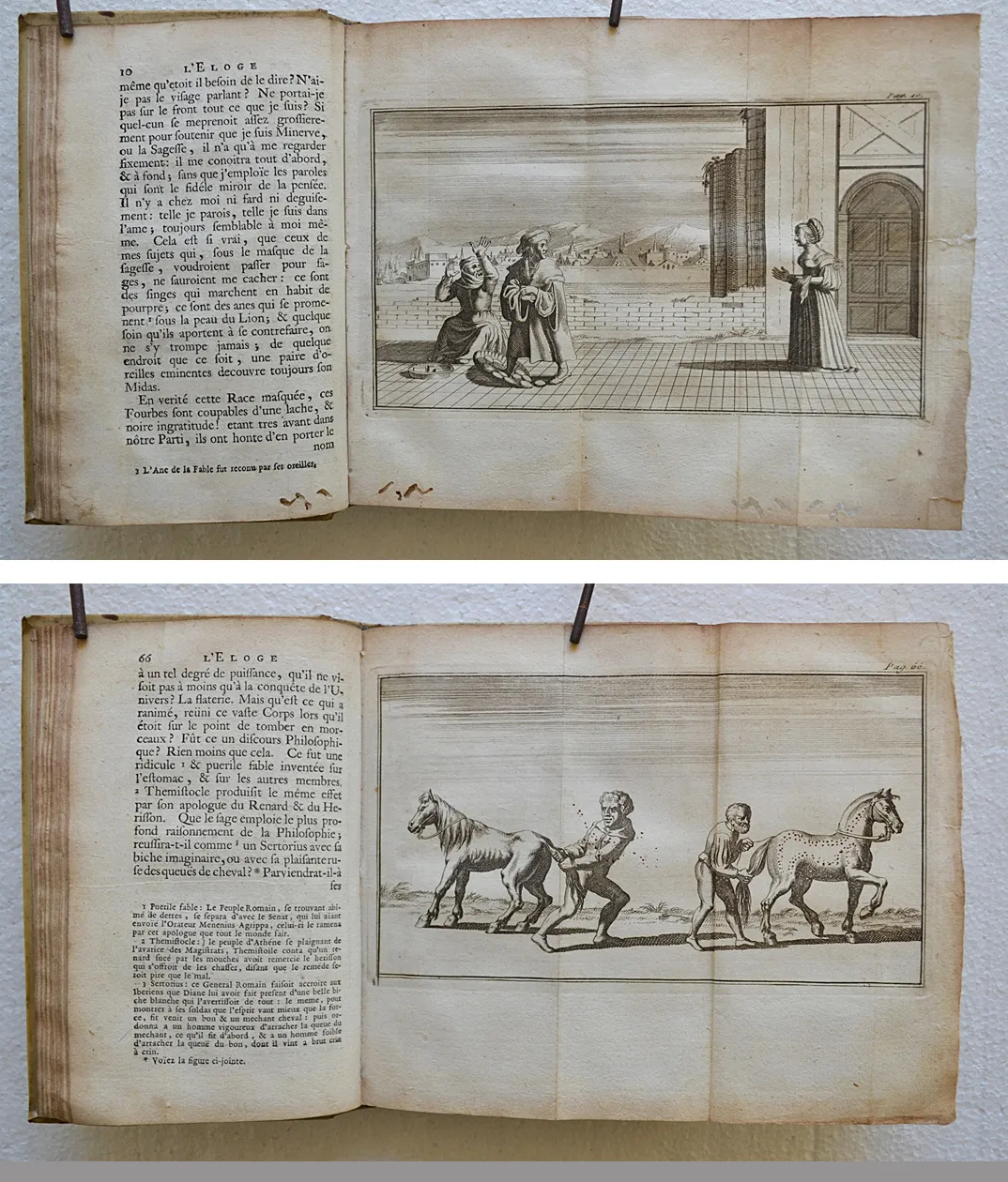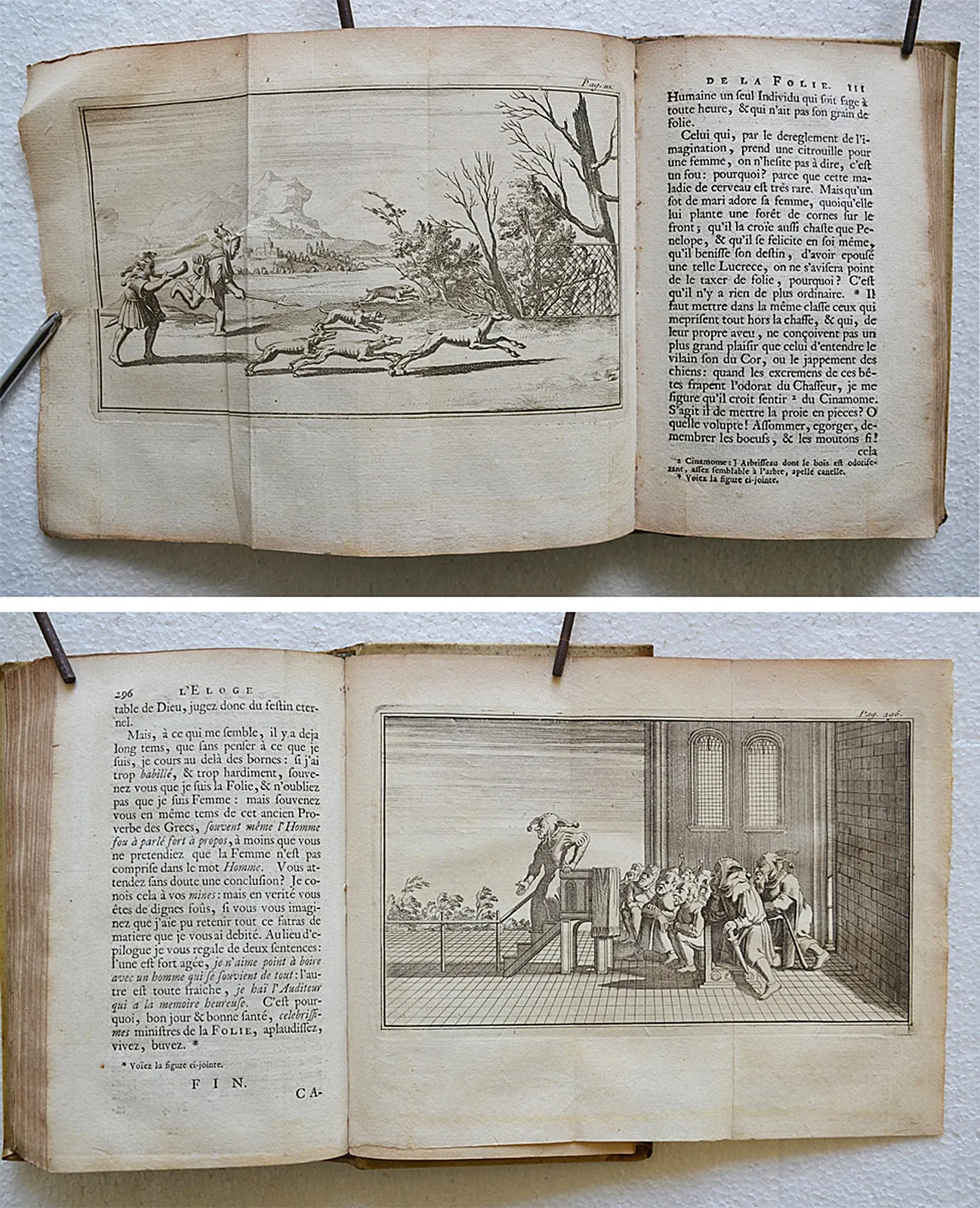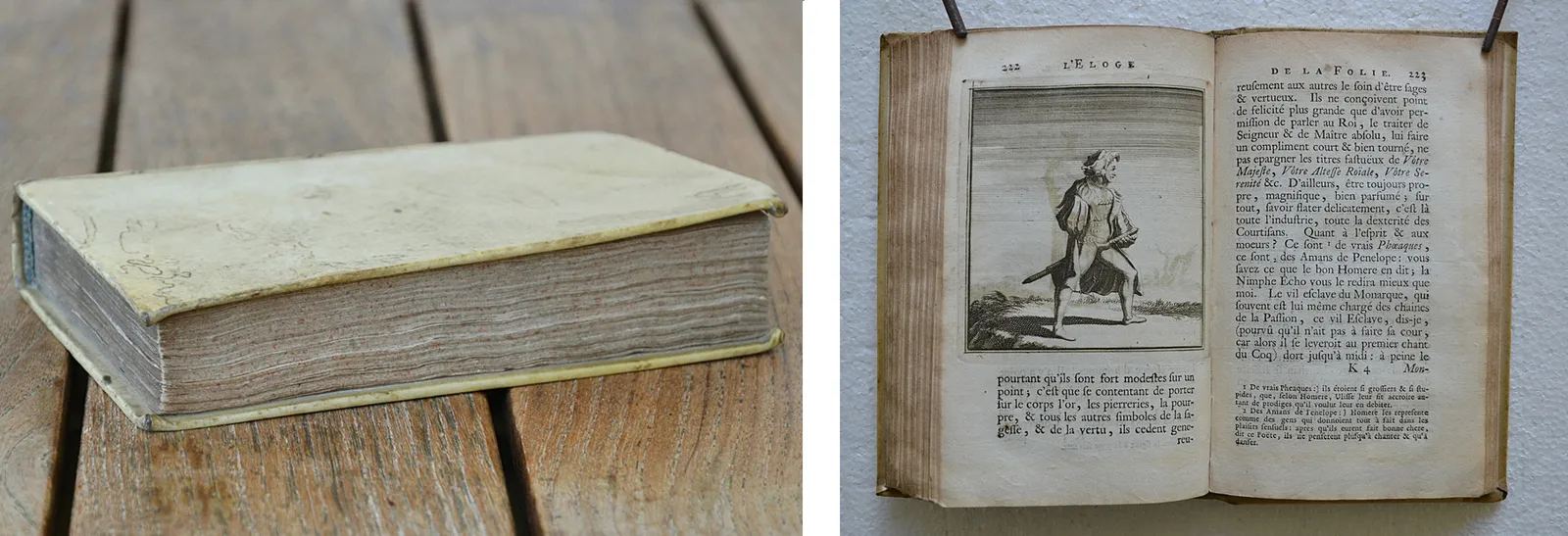 Première édition de cette traduction due à Nicolas Gueudeville (1652-1721, moine bénédictin défroqué converti au calvinisme, historien et pamphlétaire) ; et premier tirage des figures gravées d’après Holbein. L’illustration entièrement gravée sur cuivre se compose d’une planche représentant les portraits d’Érasme, d’Holbein et de Thomas More, d’un frontispice allégorique, de 75 vignettes dans le texte et de 5 planches dépliantes (sur 6) d’après les dessins d’Holbein. Armes de Jean de Bye, bourgmestre de Leyde, gravées sur cuivre en tête de la dédicace.