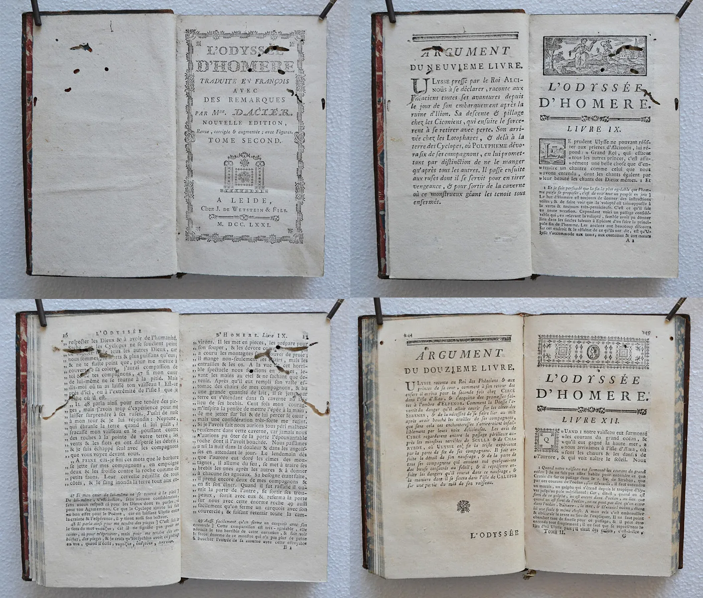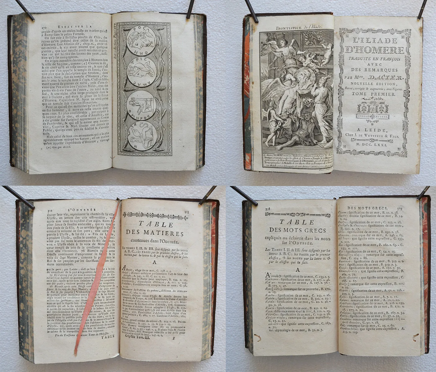 Petite fente sur deux mors ; épidermures ; quelques rousseurs sur les deux premiers volumes de l’Iliade et une trace de mouillure dans la marge supérieure de plusieurs feuillet dans le deuxième volume (sans gravité) ; premier feuillet blanc de l’Odyssée, presque détaché.