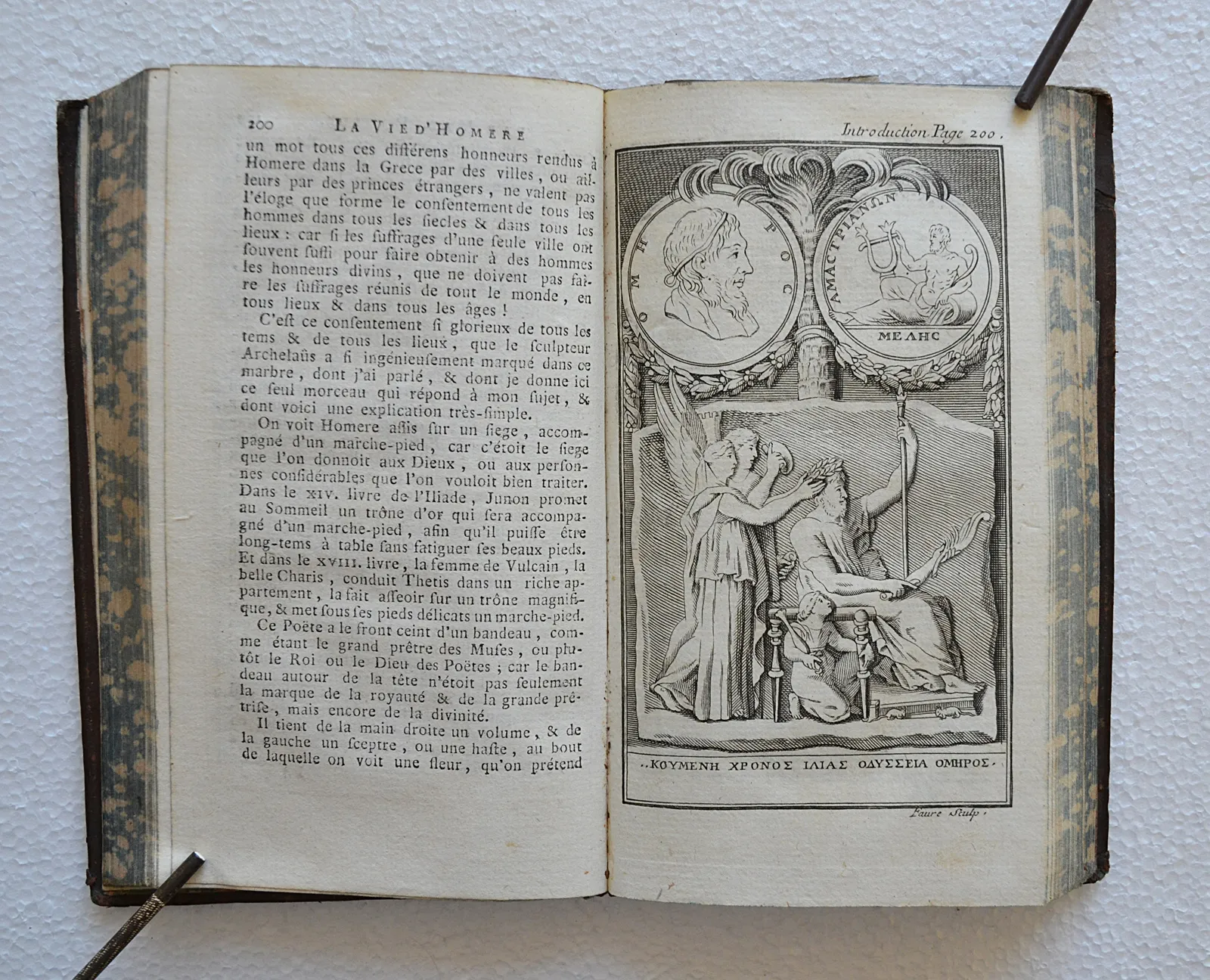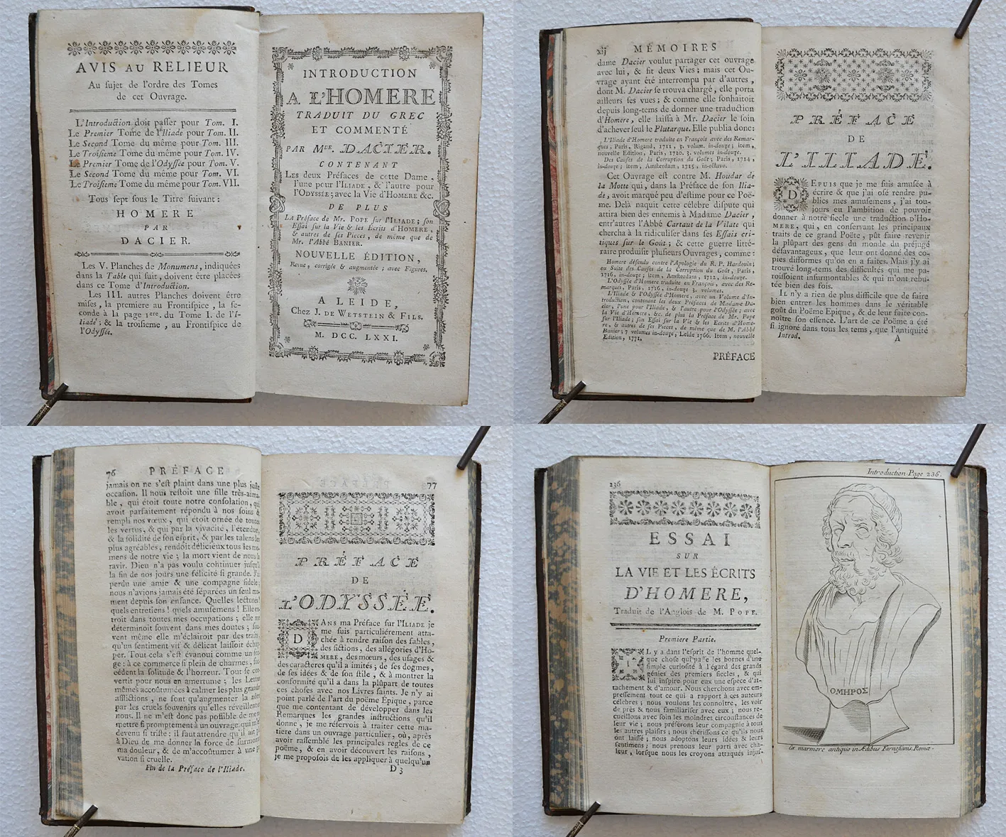 1772, in-8, veau fauve moucheté, quelques rousseurs sur les deux premiers volumes de l’Iliade et une trace de mouillure dans la marge supérieure de plusieurs feuillet dans le deuxième volume (sans gravité), 394 pages.