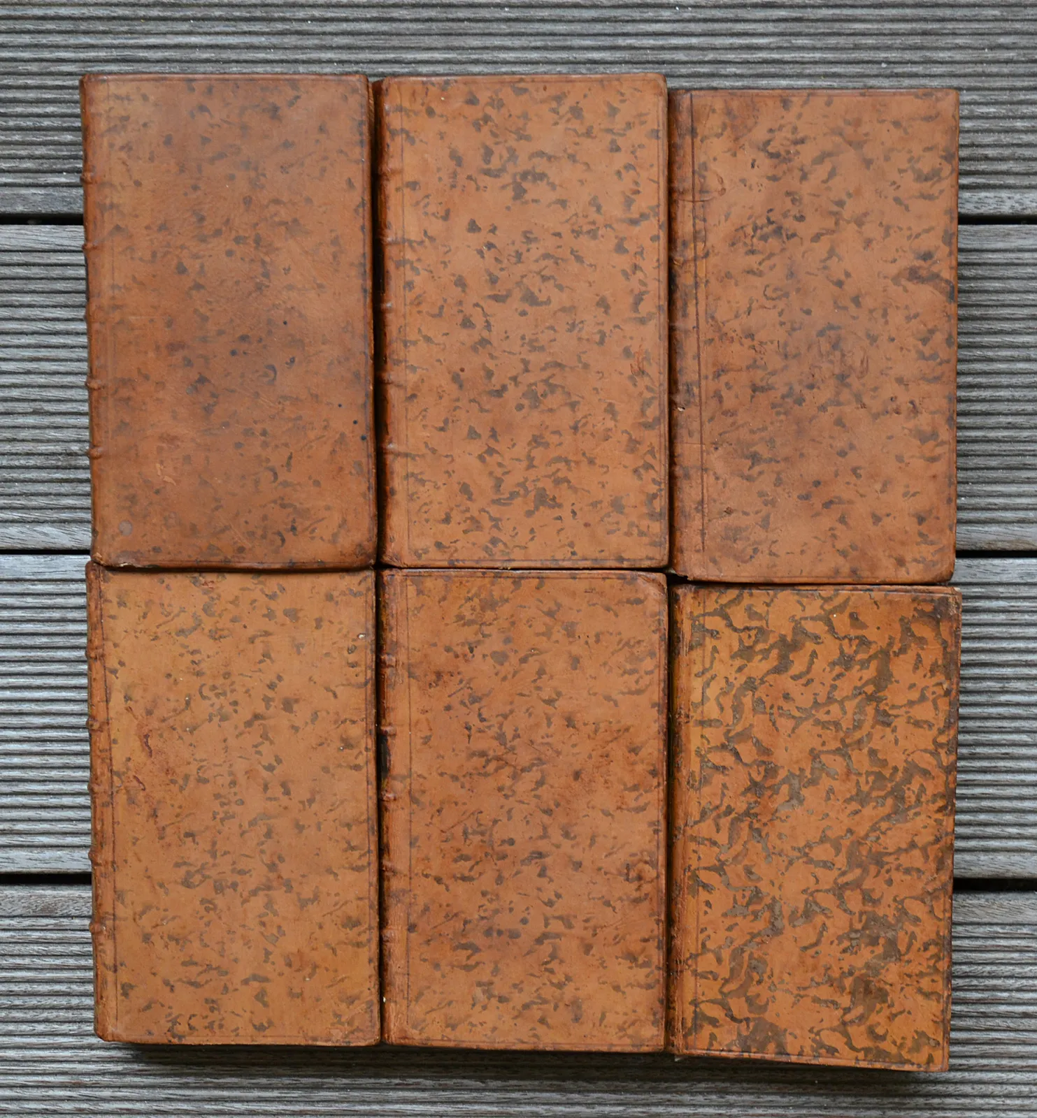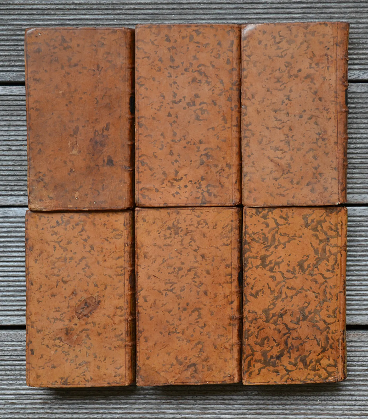 Six volumes in-12 (10 x 17 cm.) de : XXIV – 575 pp. + (4ff.) – 544 pp. – (1f.) + VII – 602 pp. – (1f.) + XI(1) – 472 pp. + V(1) – 507 pp. ; veau fauve marbré, filet à froid sur les plats, dos à nerfs ornés, filet doré sur les coupes, tranches marbrée (reliures de l’époque, celle de la Théorie du bonheur est différente).