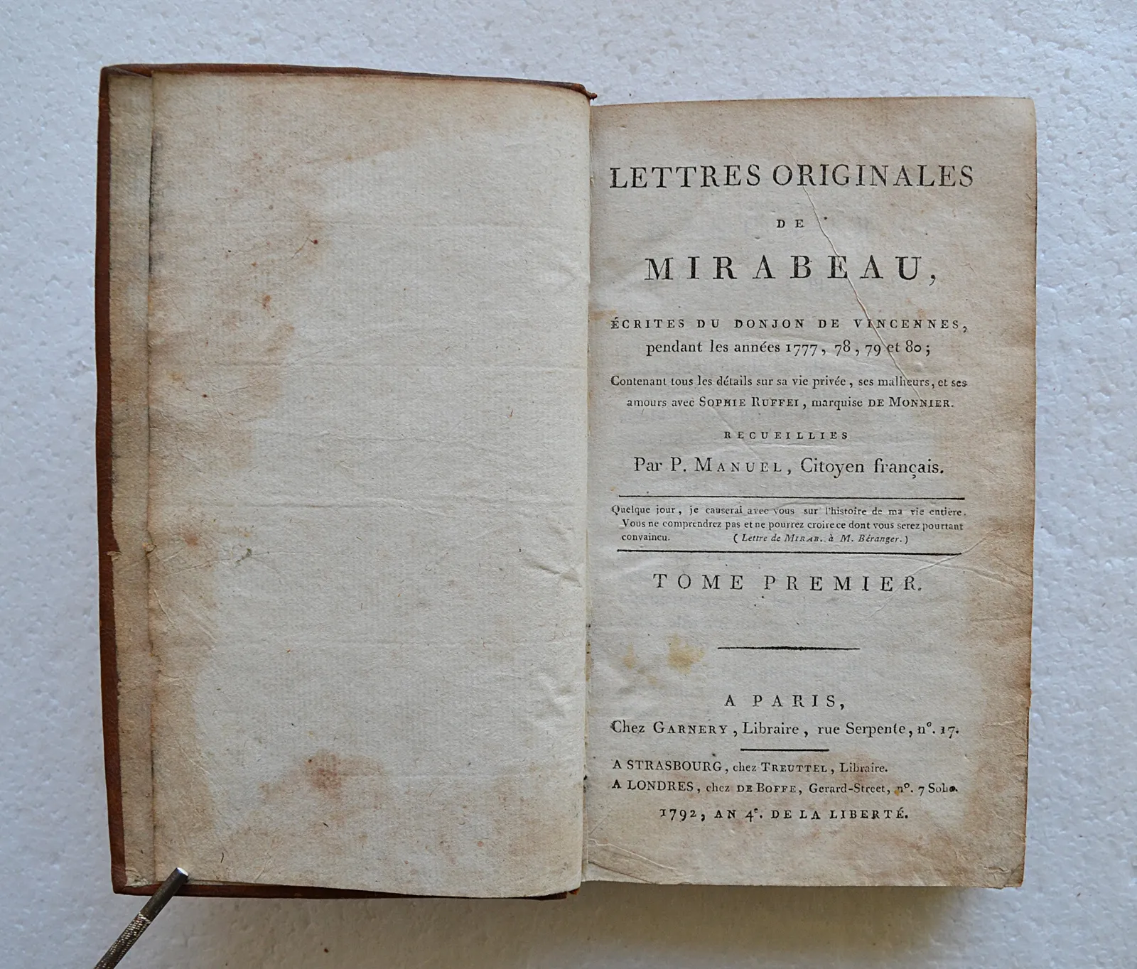 A Paris, chez Garnery, à Strasbourg, chez Treuttel, à Londres, chez de Boffe, 1792, an 4 de la Liberté.