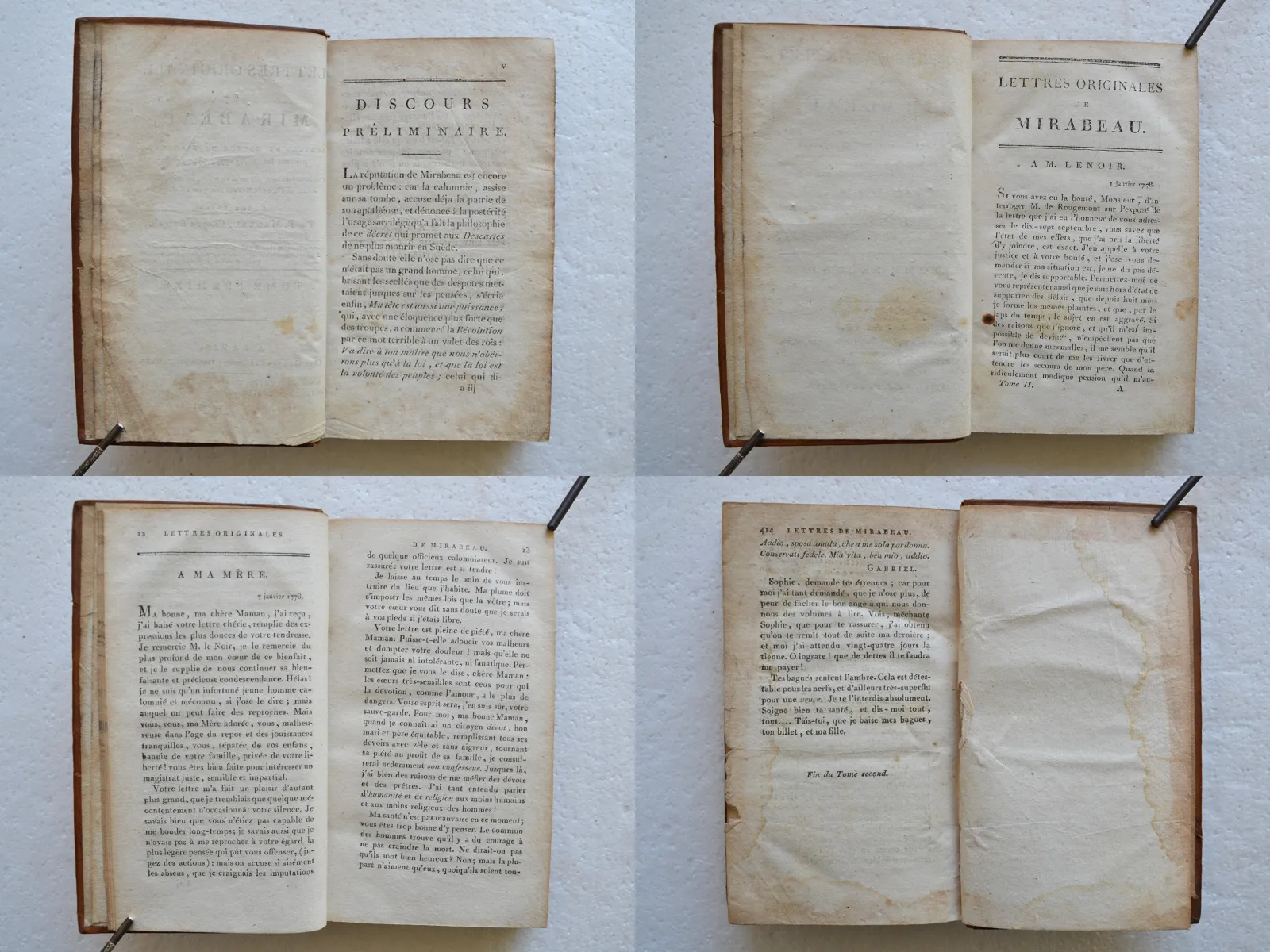 Quelques trous de ver sur les dos ; un mors fendillé ; rousseurs et traces de mouillures par endroits ; déchirure avec perte de papier dans la marge inférieure de deux feuillets (sans perte de texte).