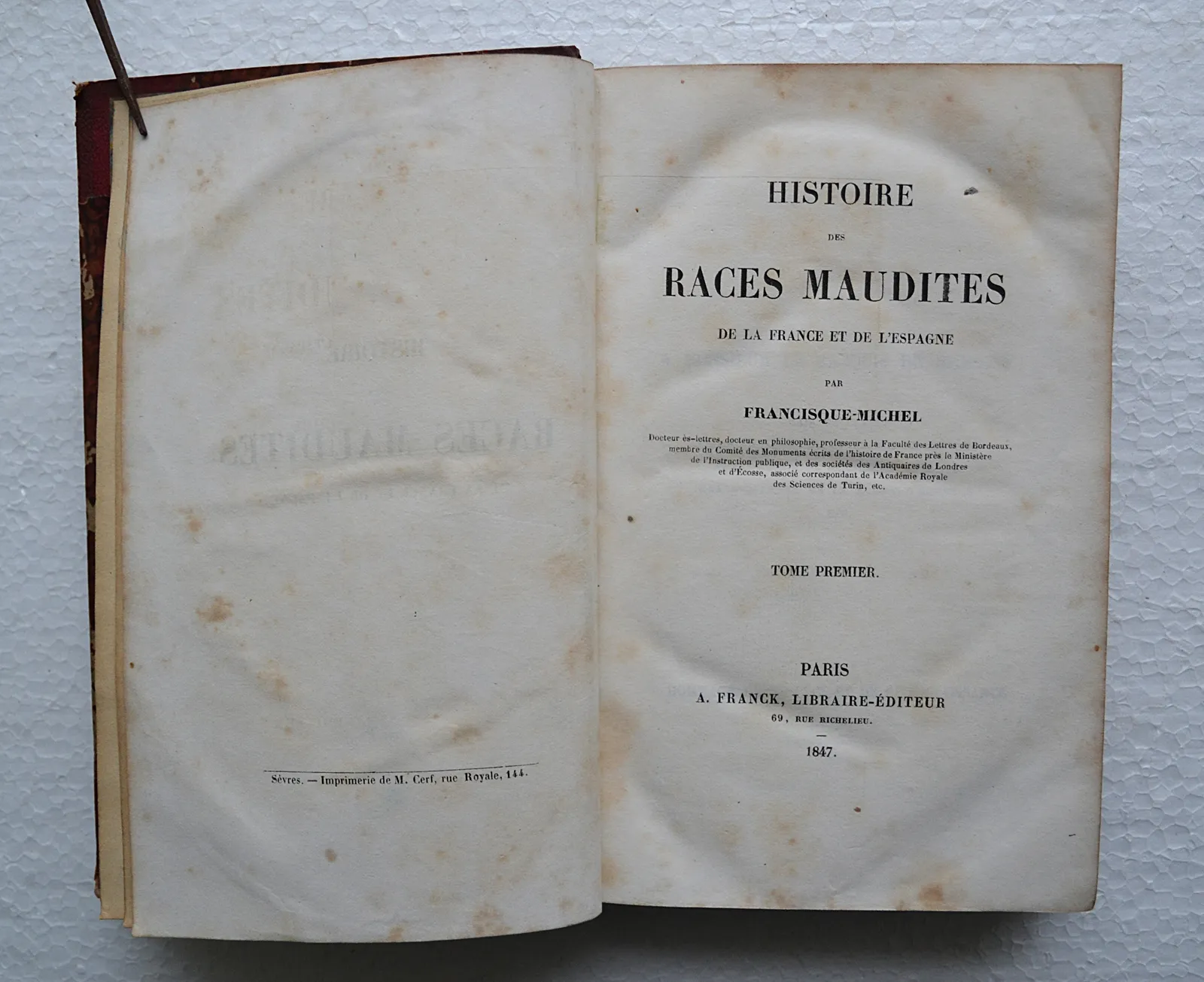 « Au milieu du XIXème siècle paraissait cet important ouvrage consacré aux « races maudites », en l’occurrence aux fameux « Cagots » qui dans les siècles passés avaient fait écrire beaucoup d’élucubrations… Francisque-Michel va les étudier au moment où ils ne se sont pas encore entièrement fondus dans la population « non-cagote », c’est ce qui rend son livre primordial. Son étude, d’une grande érudition, est un véritable « état des lieux » de la question. Il aborde en premier les lieux habités et l’histoire particulière de cette race maudite, particulièrement en Gascogne, en Bretagne (les Caqueux), au pays Basque et en Navarre. Il étudie ensuite la condition, les droits et obligations des Cagots, les lois et règlements qui les régirent et enfin les procès qu’ils soutinrent courageusement pour parvenir à l’égalité des droits. La source des préjugés qui les a accablés durant tant de siècles puis les diverses opinions émises quant à l’origine des Cagots ainsi qu’à celle des noms par lesquels on les désigne terminent le tome I, avec l’amorce d’une théorie très originale et assez passionnante sur la véritable origine des « Cagots ». Un livre incontournable, systématiquement « pillé » (plus ou moins habilement) depuis 150 ans par tous ceux qui se sont penchés sur cet épineux sujet ». (Quatrième de couverture de l’édition de 2006).