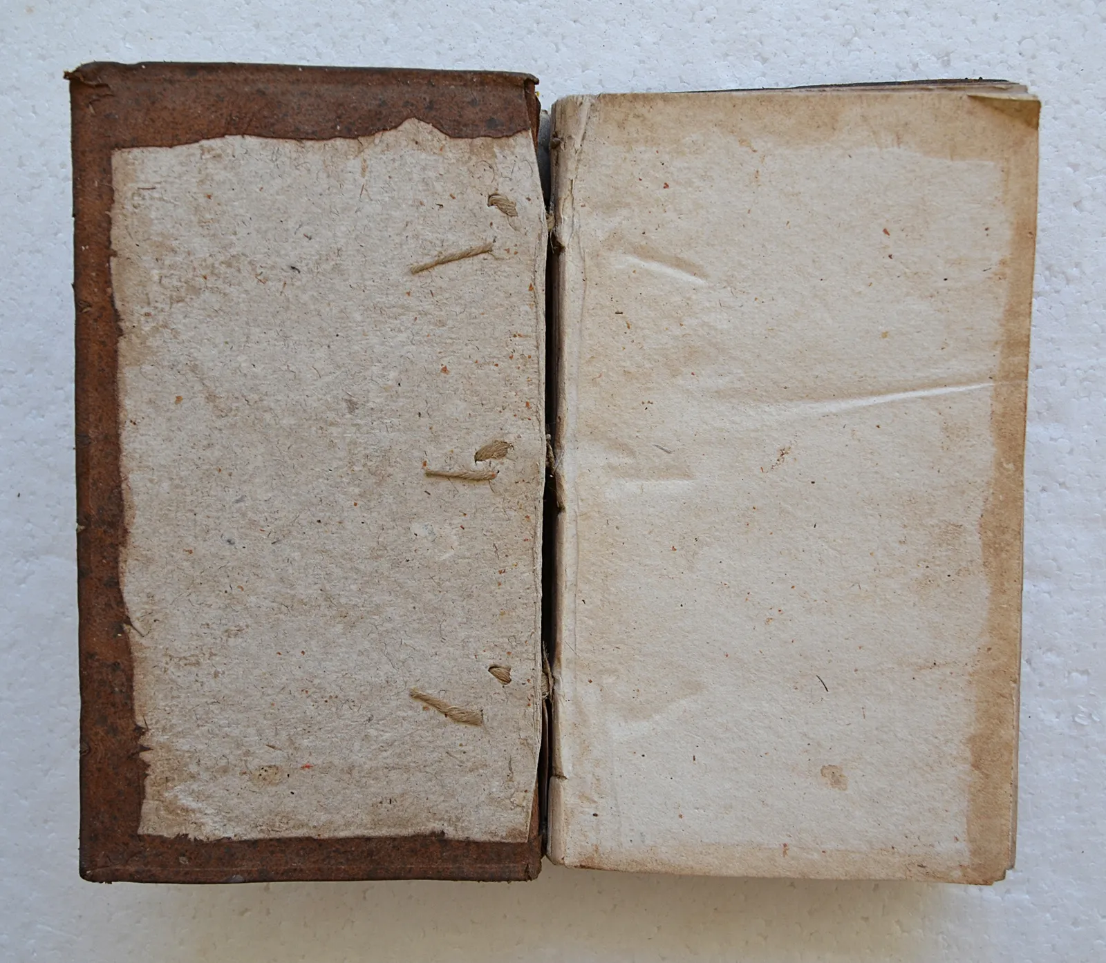 Pièce de titre du T1 absente ; accrocs sur les coiffes supérieures avec pertes de cuir ; coutures des plats du T1 distendues ; épidermures et accrocs sur les plats. Très rare impression de Saint-Sébastien du XVIII° siècle.