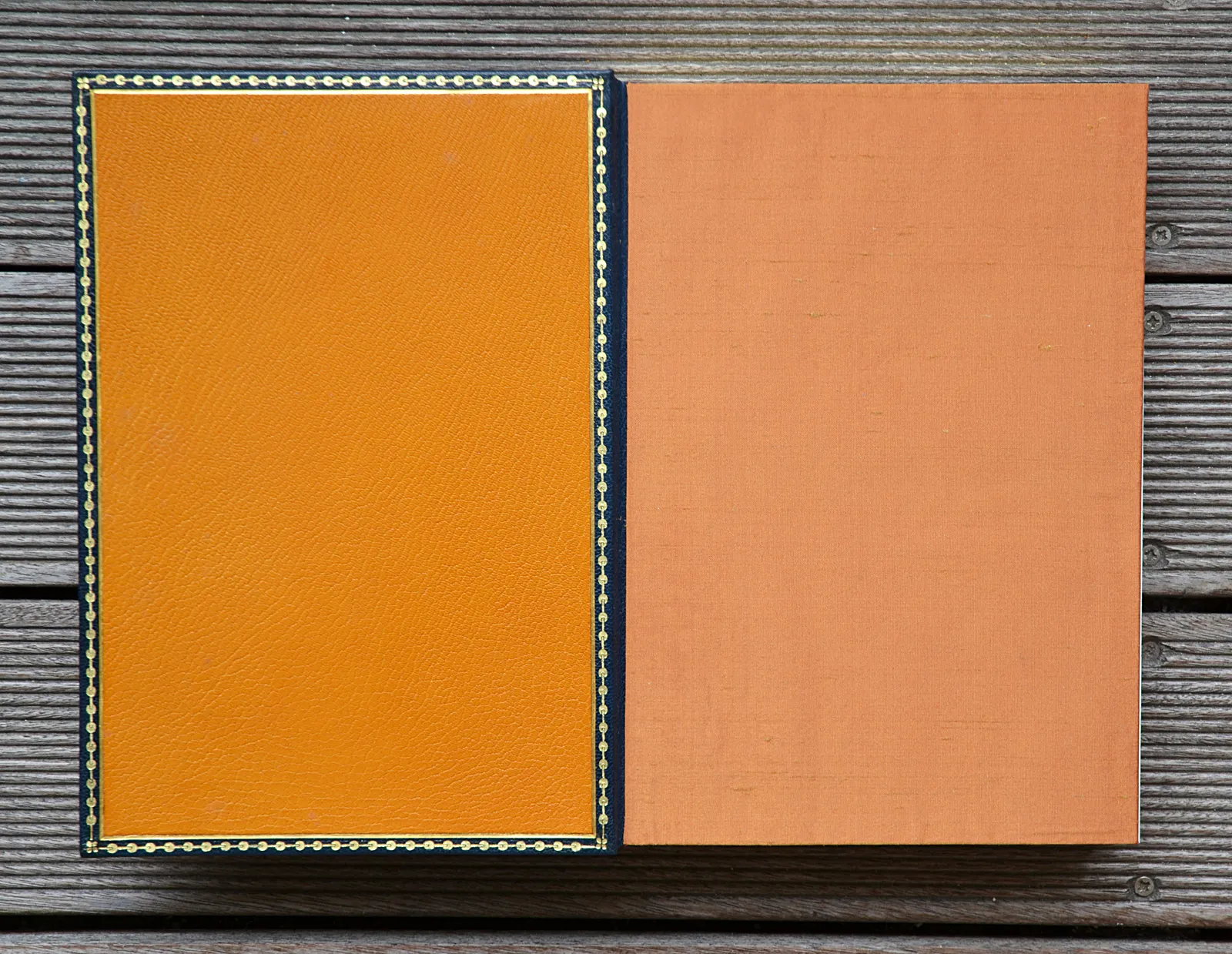 Un volume in-4 (20 x 27,8 cm.) de (4ff.) – 267 pp. – (1f.) ; maroquin bleu-nuit, dos à quatre nerfs orné de filets dorés, roulette et filet dorés à l’intérieur, doublure de maroquin havane, tête dorée, couverture et dos conservés, boite de protection avec le dos en maroquin bleu-nuit et l’intérieur en feutrine beige.