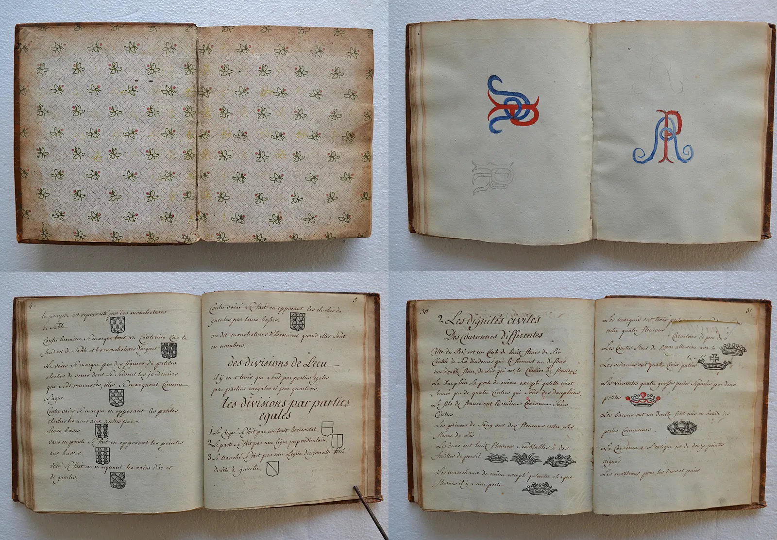 Dos en mauvais état : coiffes absentes, craquelure et perte de cuir sur les extrémités ; une découpe sur un feuillet des blasons (pp. 31/32), cf. photo) ; quelques feuillets blancs découpés.