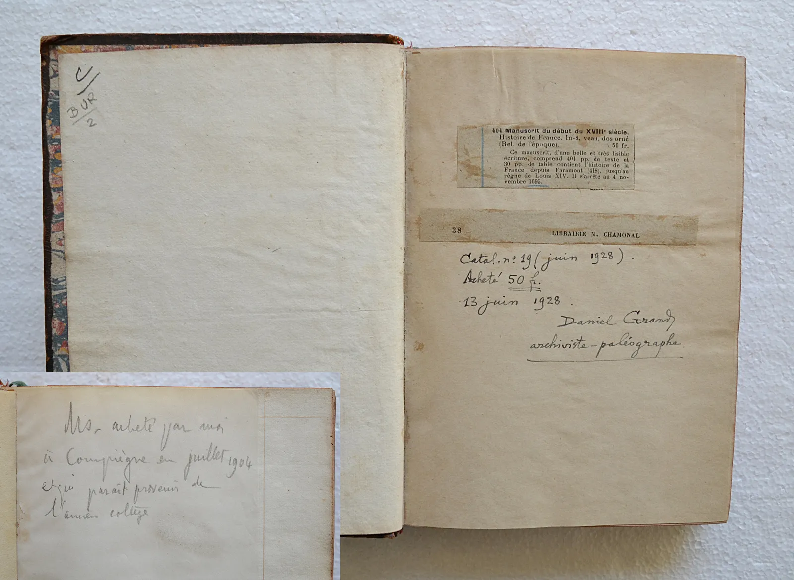 Appartenance : Daniel Grand archiviste-paléographe (ex-libris manuscrit sur un feuillet blanc ajouté postérieurement). Sur le même feuillet, une notice imprimée provenant du catalogue n°19 (juin 1928) de la Librairie Chamonal. Une autre notice, celle-ci manuscrite, a été également insérée après les deux feuillets blancs : « Manuscrit acheté par moi à Compiègne en juillet 1904 et qui parait provenir de l’ancien collège ».