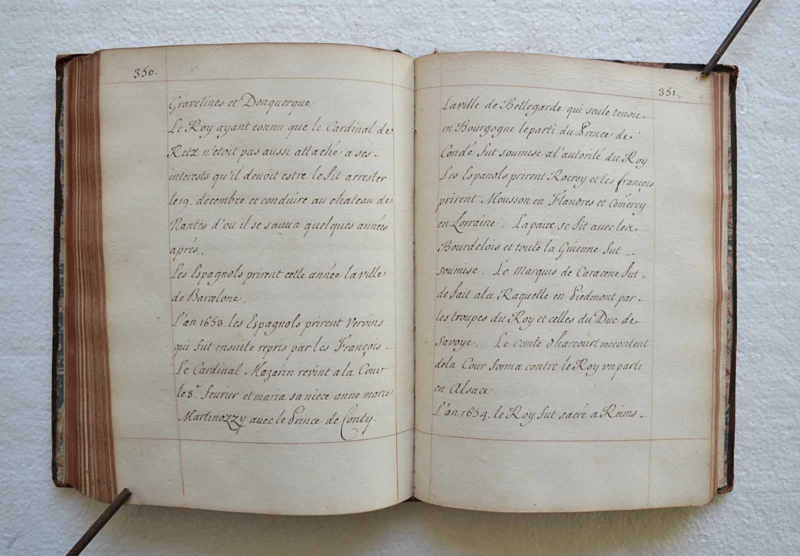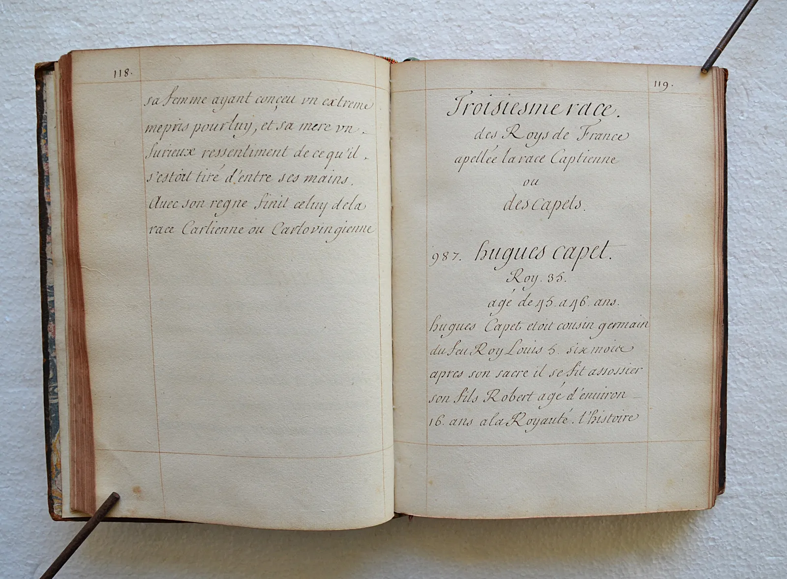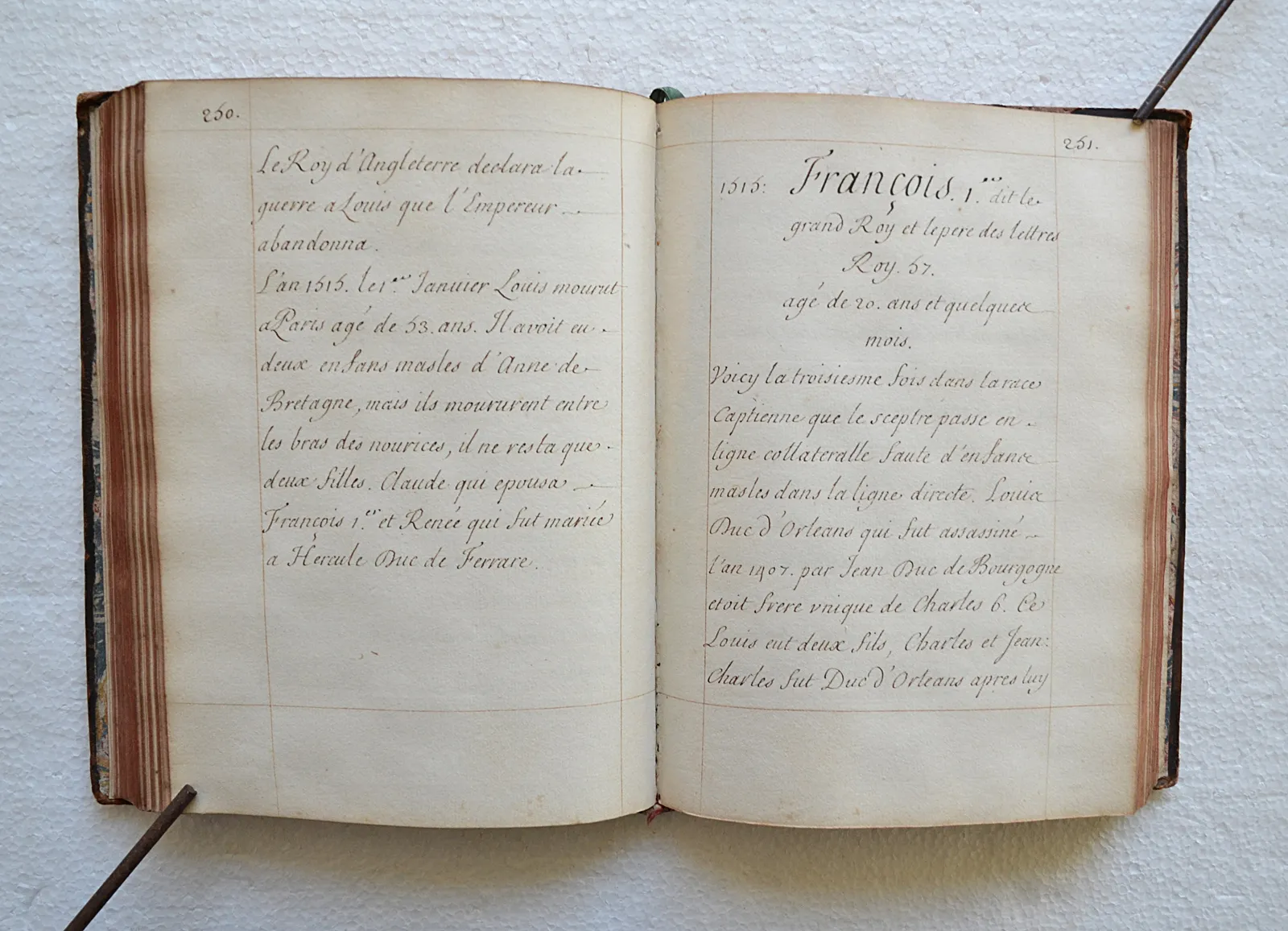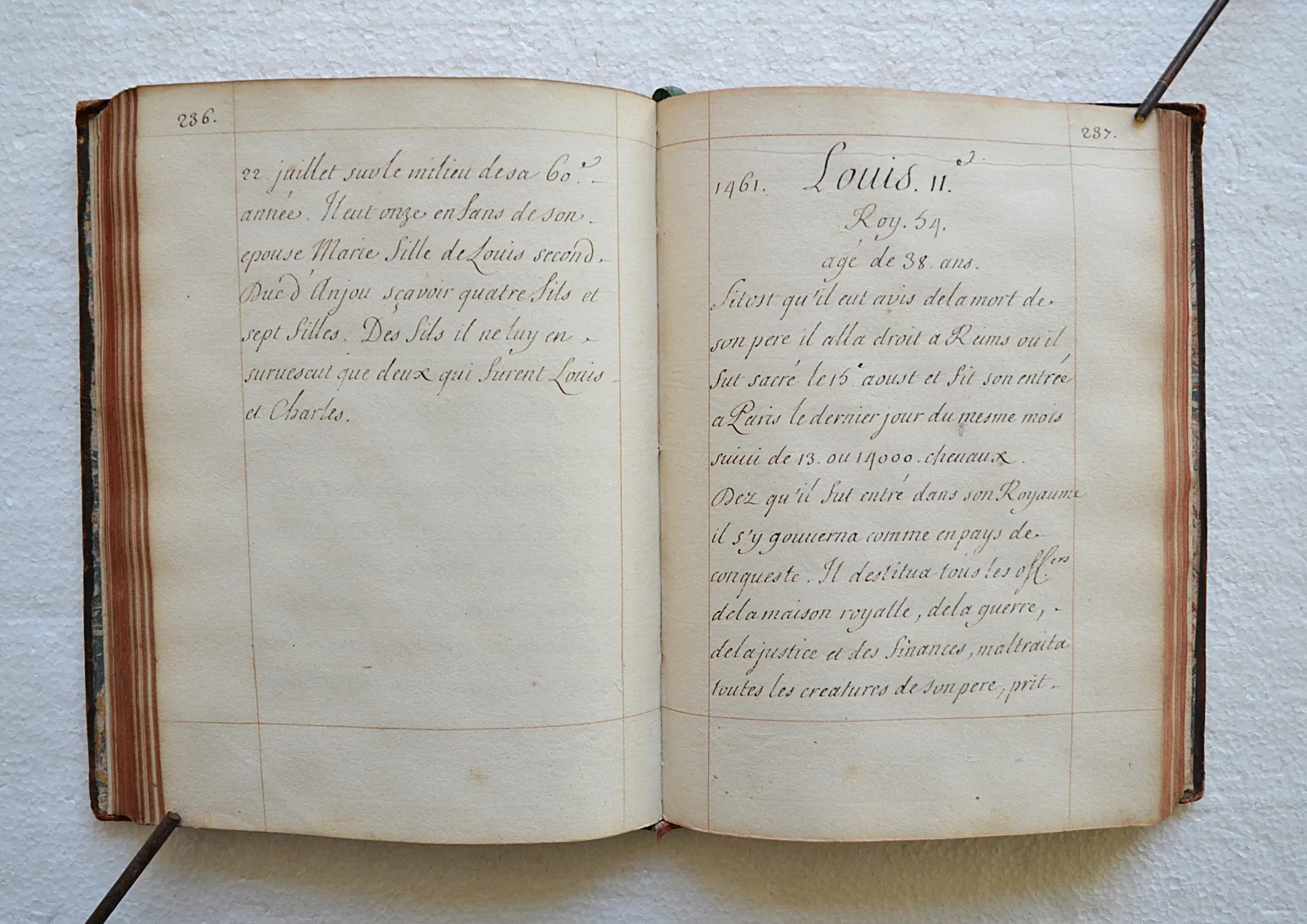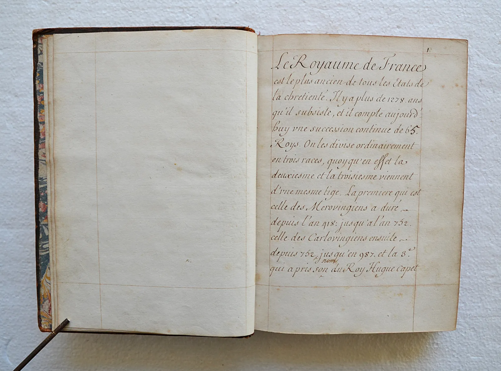 Très beau manuscrit réglé, concernant l’Histoire de France depuis Pharamond (418) jusqu’au règne de Louis XIV (le texte se termine le 4 novembre 1695).