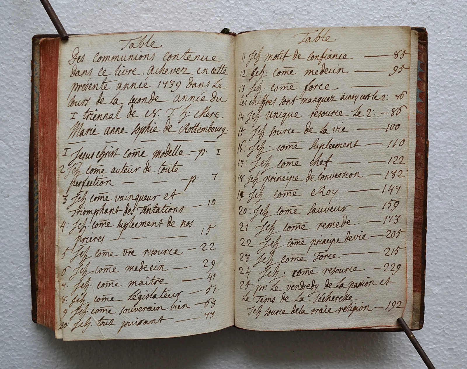Six lignes manuscrites au début des Tables : « Table des communions contenues dans ce livre. Achevées en cette présente année 1739, dans le cours de la seconde du triennal de N.T.S. (?) Mère Marie Anne Sophie de Rottembourg ».