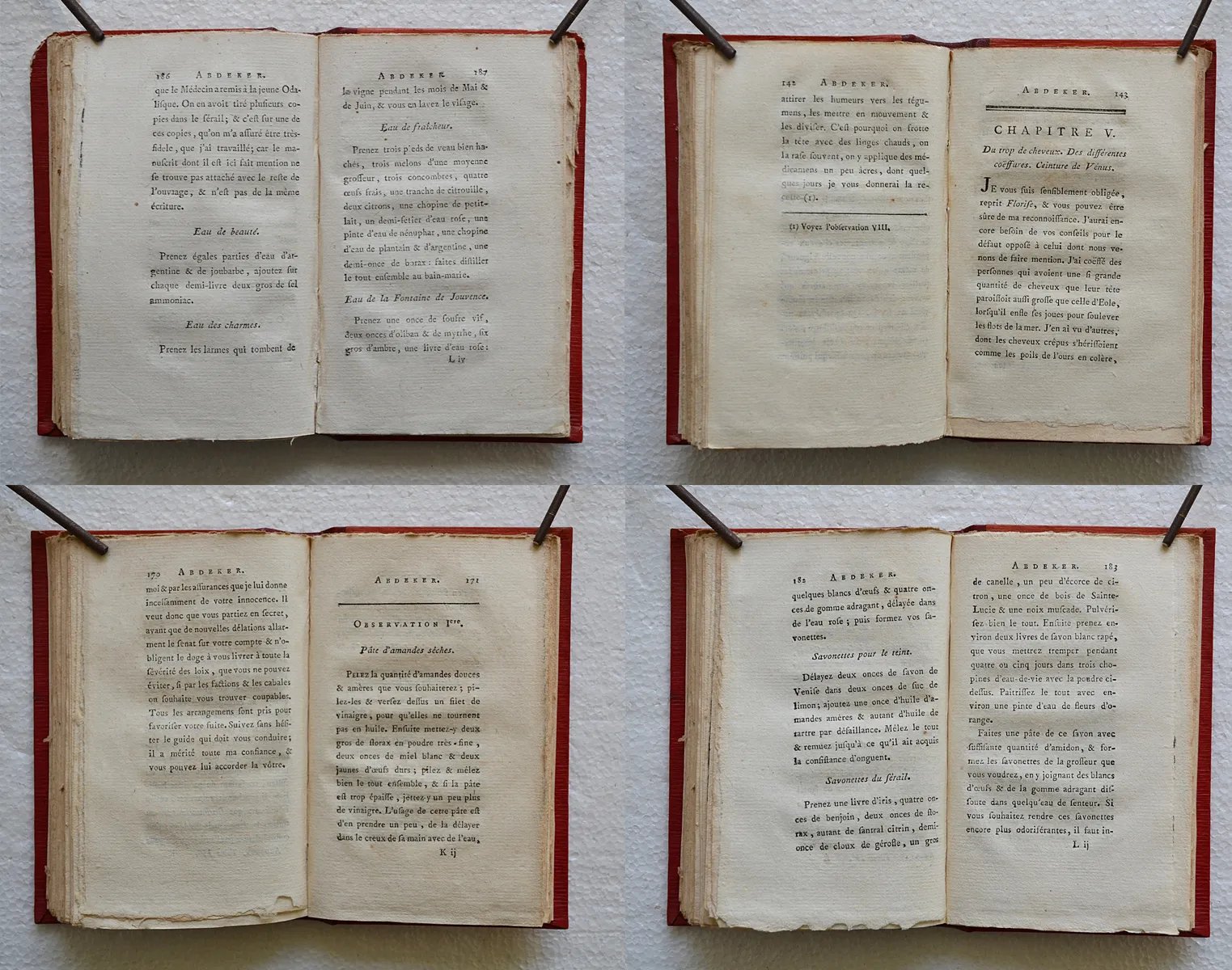 Quatre volumes in-18 (9,5 x 14,8 cm.) de VIII – 244 pp. + (2ff.) – 248 pp. + XVII – 262 pp. + (2ff.) – 248 pp. ; demi-maroquin rouge à grain long de l’époque, dos lisses ornés (petite perte de cartonnage sur les coins supérieurs du T1 ; une coupe inférieure frottée au T3).