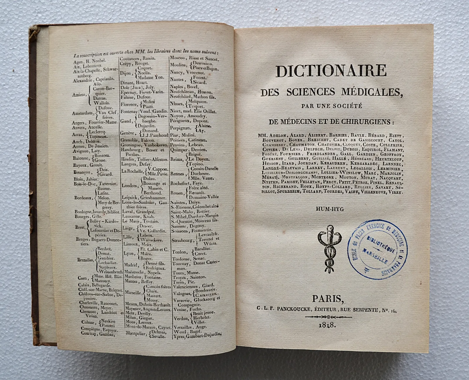 Cette édition de 60 volumes in-8° (35.000 pages), parue de 1812 à 1822, est le premier dictionnaire médical encyclopédique du XIXe siècle. Elle est l’œuvre de Charles-Louis-Fleury Panckoucke (1788-1844), fils d’un célèbre imprimeur-libraire de l’Ancien Régime qui abandonna en 1807 la carrière de secrétaire de la présidence du Sénat pour se consacrer à de grandes entreprises d’éditions. Sa première publication fut ce Dictionnaire des sciences médicales, pour lequel il fit appel aux plus grandes signatures de l’époque, comme Alibert, Pinel, Esquirol, Laennec, Desgenettes ou Larrey. En plus de 4.000 notices et un peu plus de 100 illustrations, ce dictionnaire tente de faire la synthèse du savoir médical de l’époque, à la naissance de la clinique et de l’anatomie-pathologie. Il rencontra un grand succès commercial et assura une large promotion de la pensée médicale française.